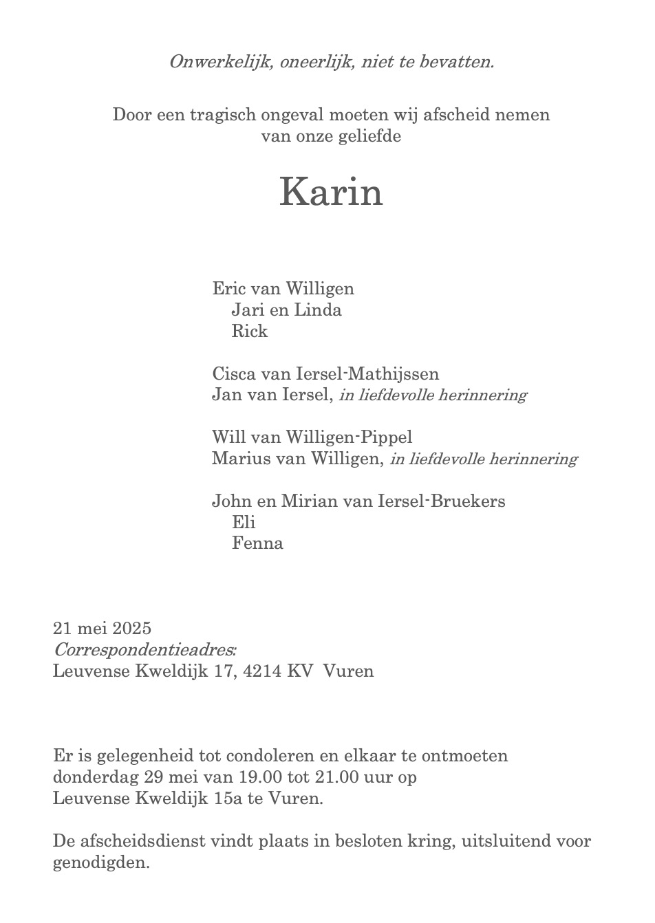 Overlijdensbericht | Karin van Willigen – van Iersel †