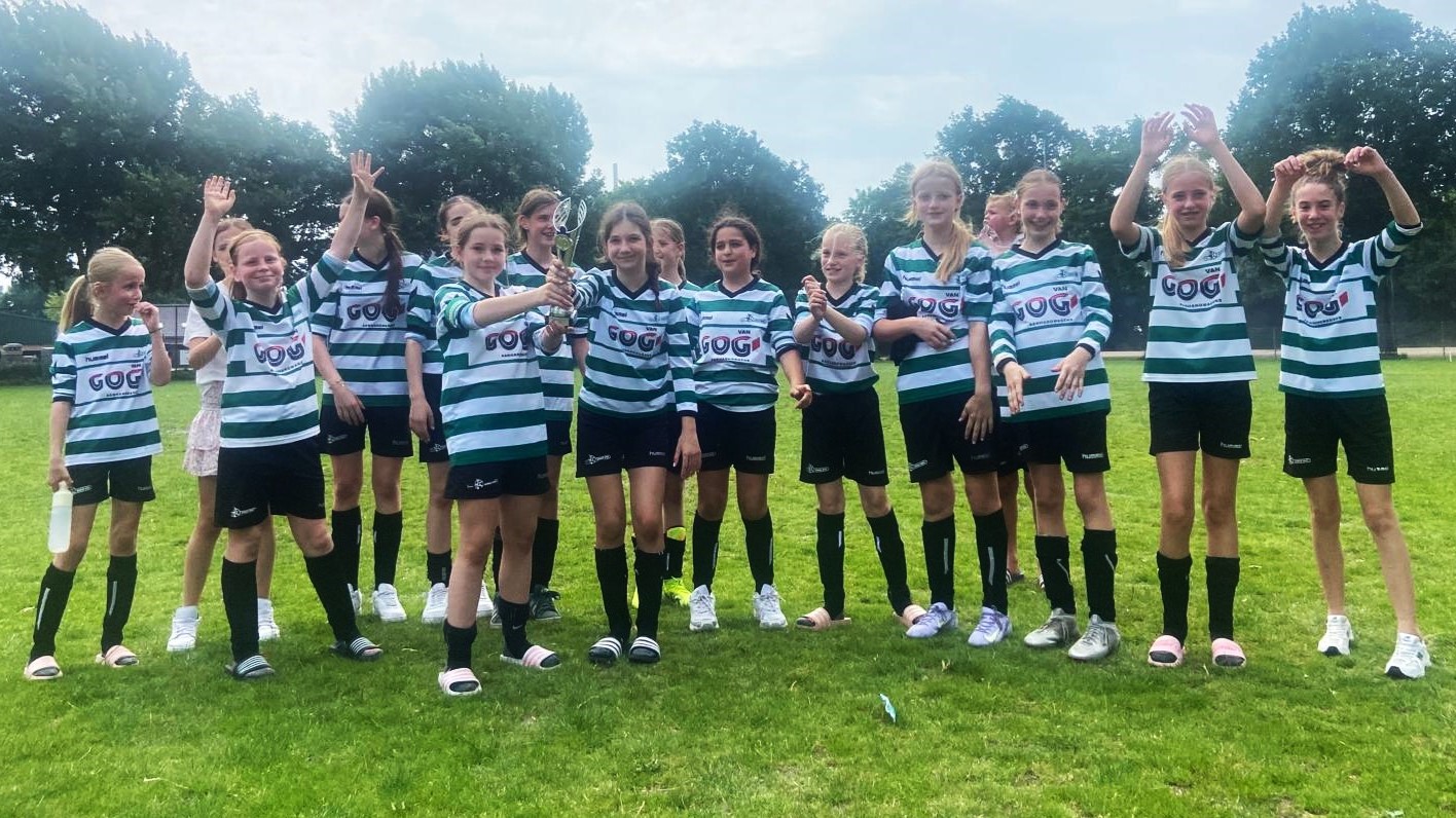 Op zaterdag 14 juni verzamelde de groep in de vroege morgen op het parkeerterrein bij FC Oda. De meiden druppelden binnen en zochten een plekje op onder de bomen. Het was warm en ze begonnen aan het toernooi met de brilstand 0-0. De 2e wedstrijd werd met 2-0 gewonnen en de 3e poulewedstrijd werd gewonnen met 1-0. In de halve finale tegen Mierlo Hout werd gewonnen met 2-0. Op naar de finale! Bijna niemand had ooit een finale gespeeld, dus het was van tevoren spannend voor de meiden. Met toen al rode snoetjes stapten ze het veld op voor de finale. Alles geven was het motto en met flink wat support werd de finale met 4-0 gewonnen tegen FC Eindhoven MO13. Wat zijn de meiden gegroeid.