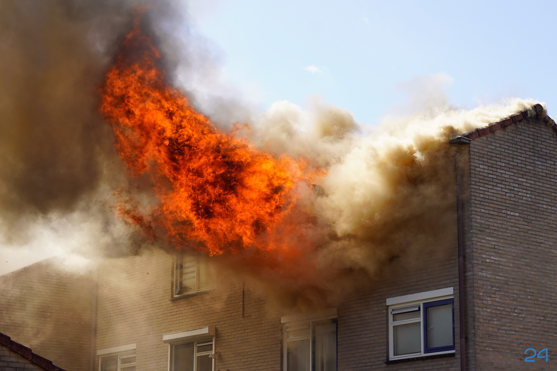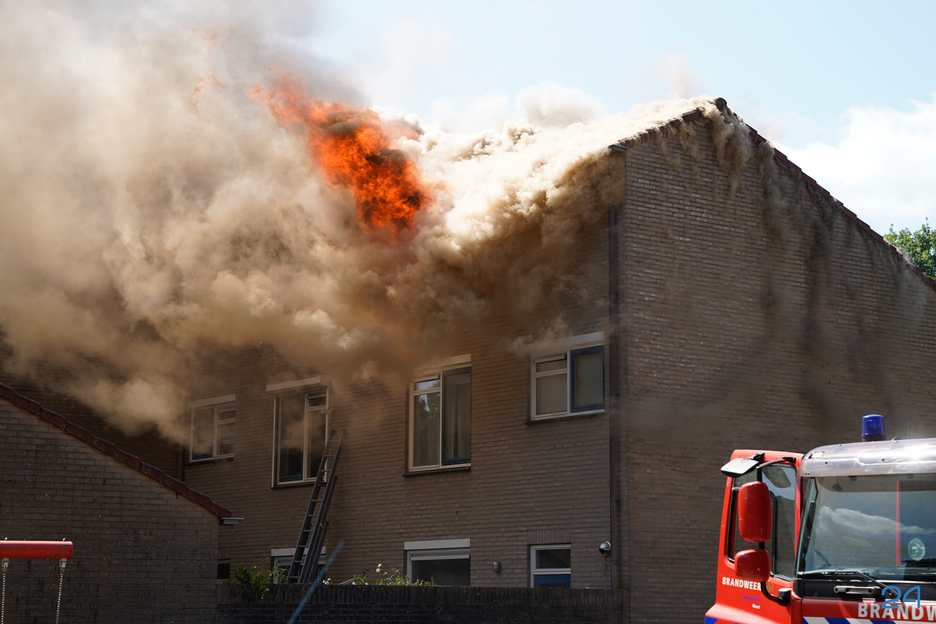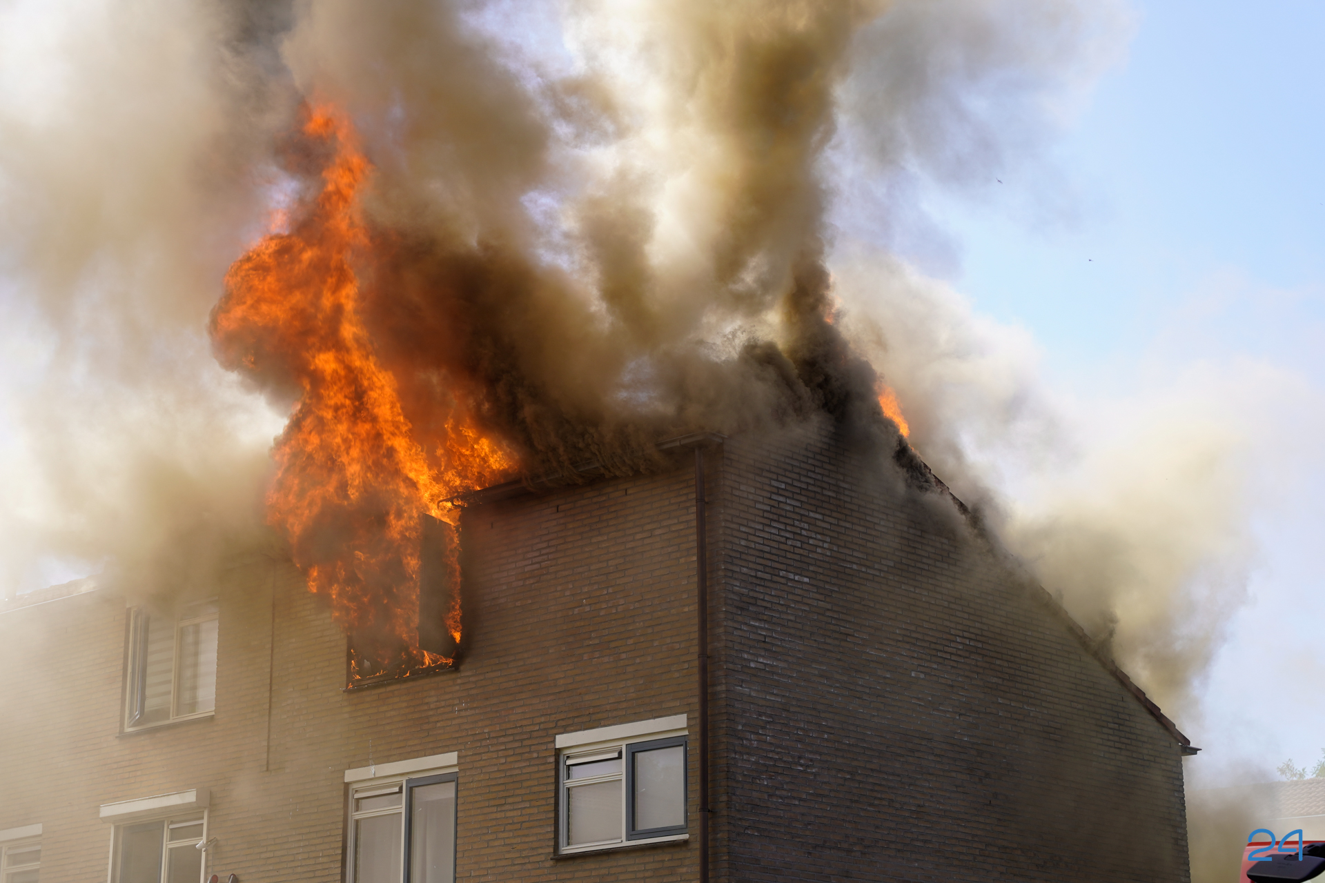 De eerste melding van de brand kwam binnen rond 11.25 uur. Al snel werd opgeschaald van een ‘middelbrand naar ‘grote brand’. De vlammen sloegen metershoog uit het raam van de bovenverdieping en het dak.
