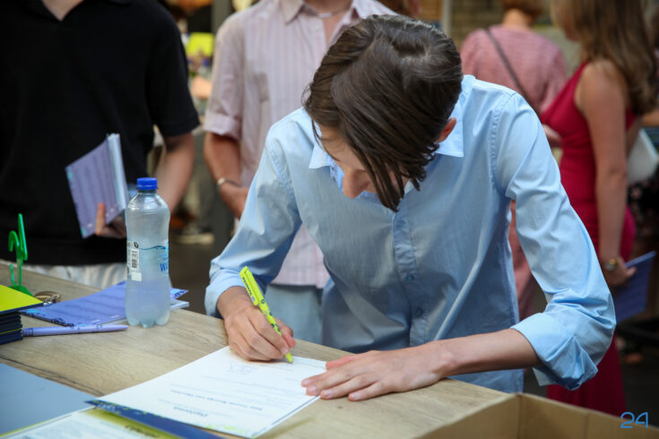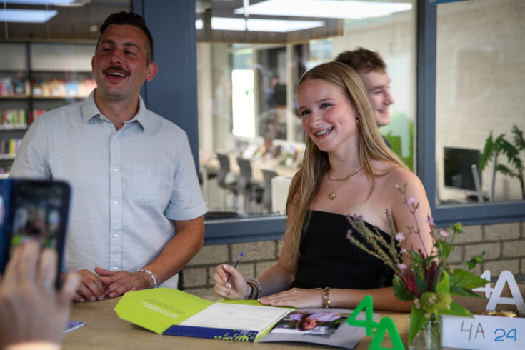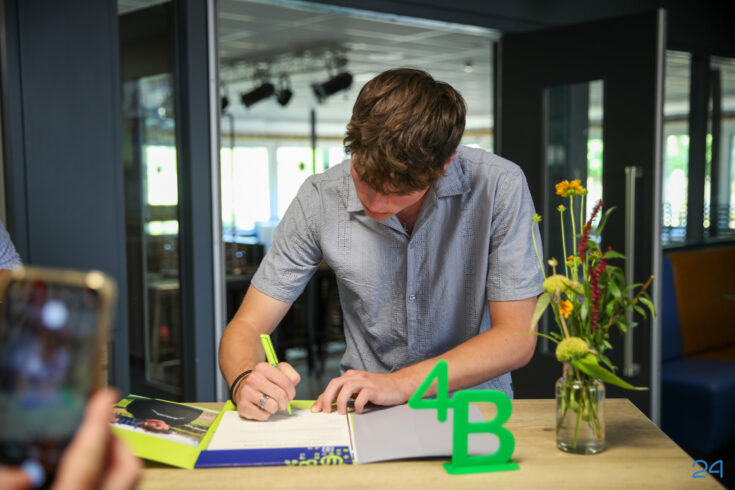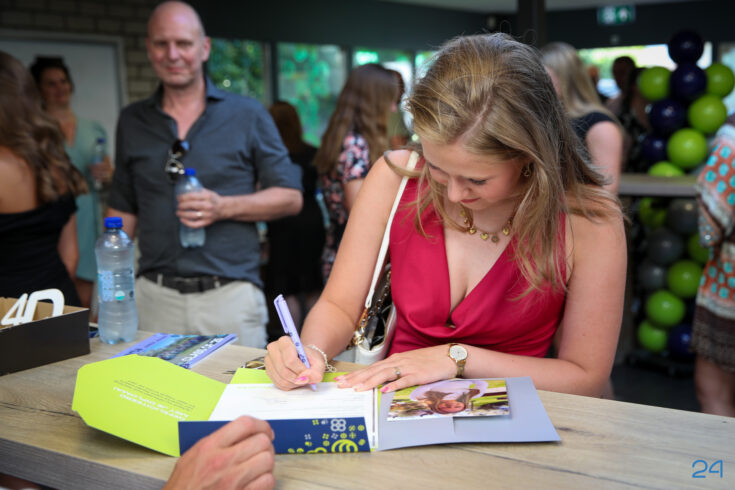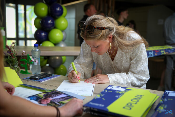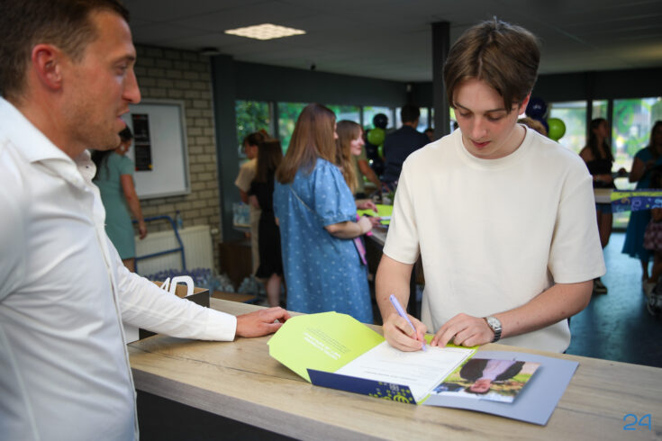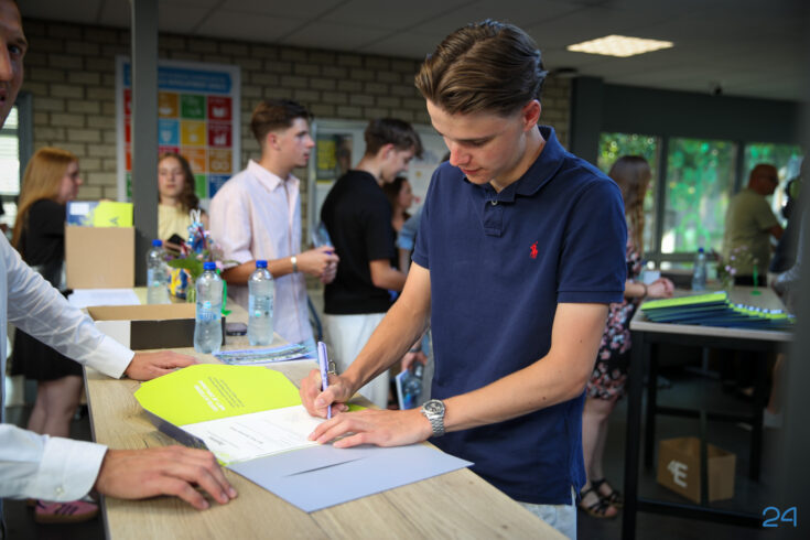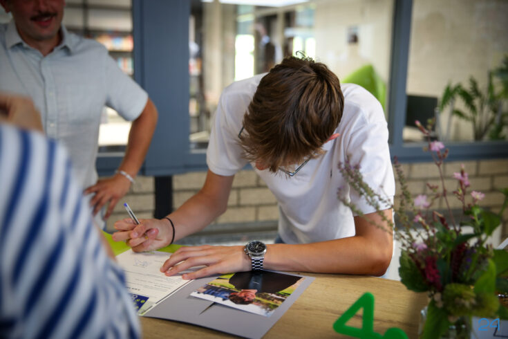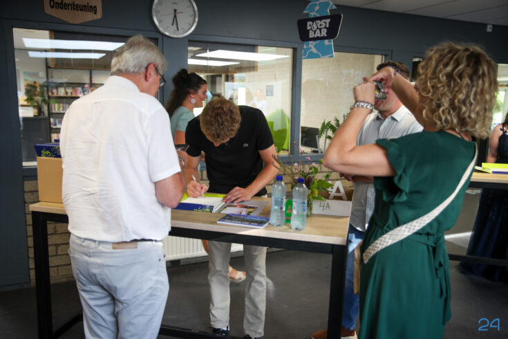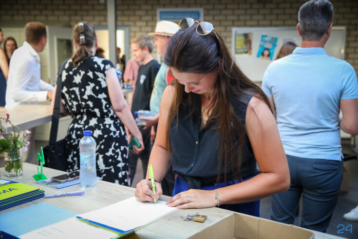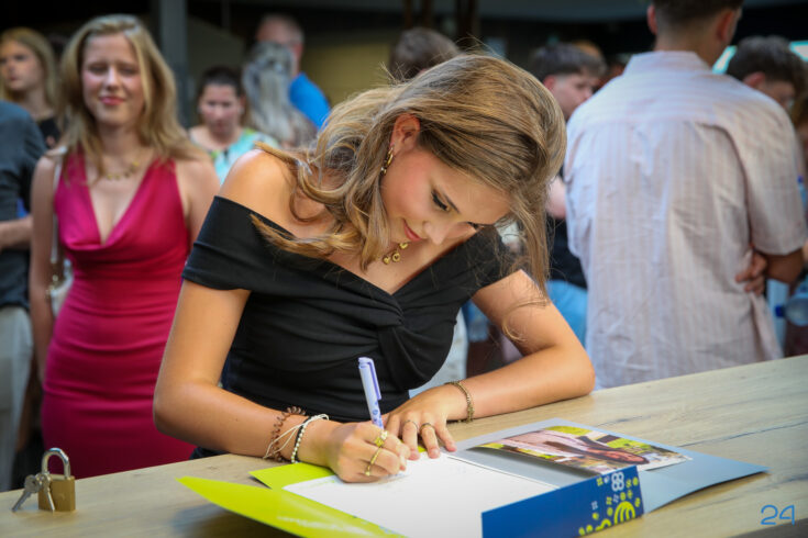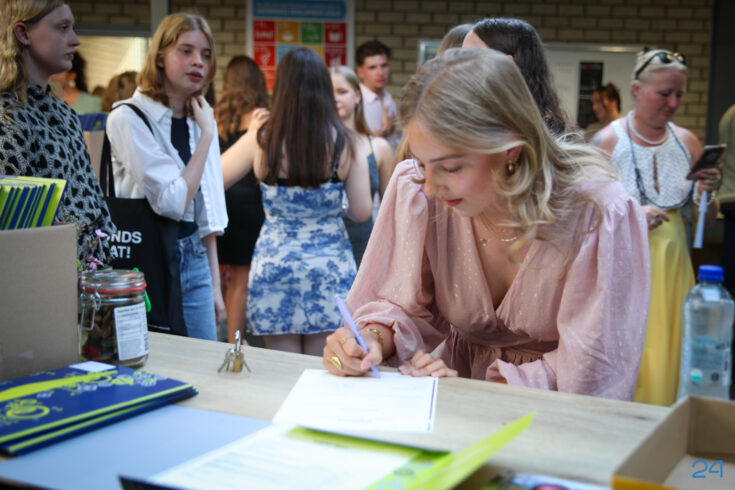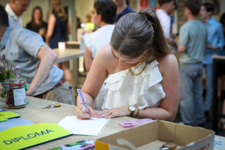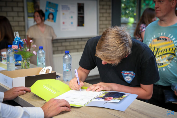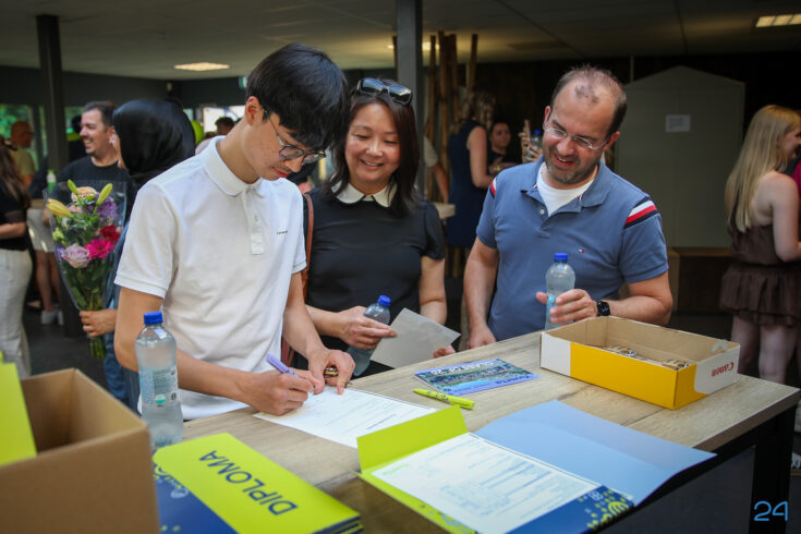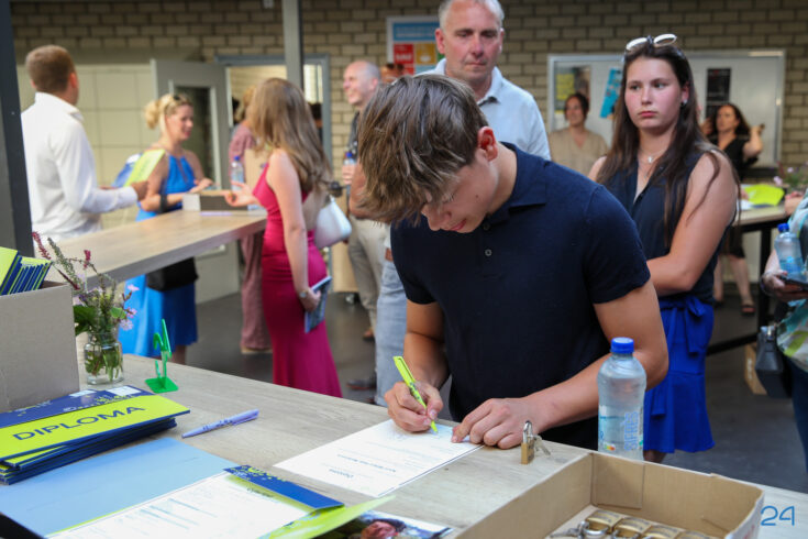 Bij binnenkomst mochten de leerlingen in het bijzijn van hun coach het diploma ondertekenen. Hierna nam de familie alvast plaats in de tuin en verzamelden de examenkandidaten zich voor hun gezamenlijke opkomst over de rode loper.