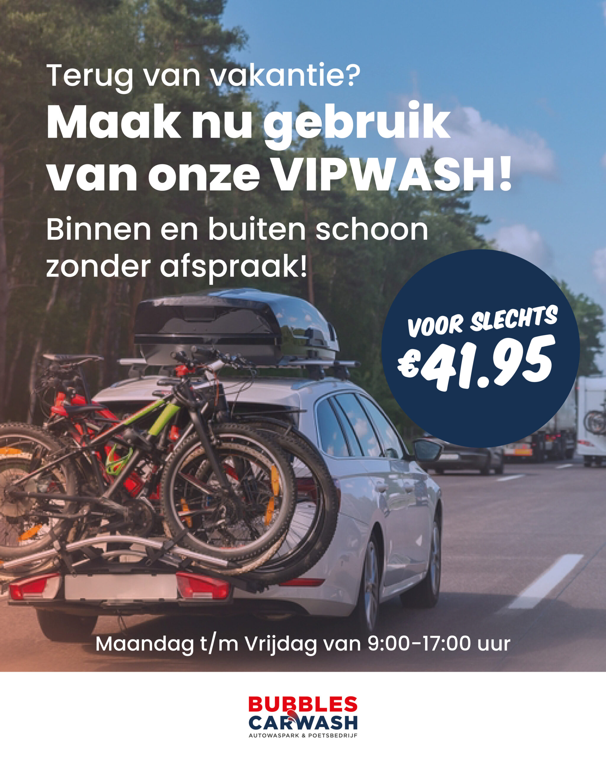 Je hebt vast geen zin of tijd om na een heerlijke relax vakantie je auto nog van binnen en buiten te poetsen. Laat het over de experts bij Bubbles Carwash. Terwijl je geniet van een heerlijk kopje koffie wordt je auto van binnen en buiten weer opgefrist. Zo kan jij nog even met je gedachten in de vakantiesfeer blijven. Probeer daarom eens het VIP WASH wasprogramma.
