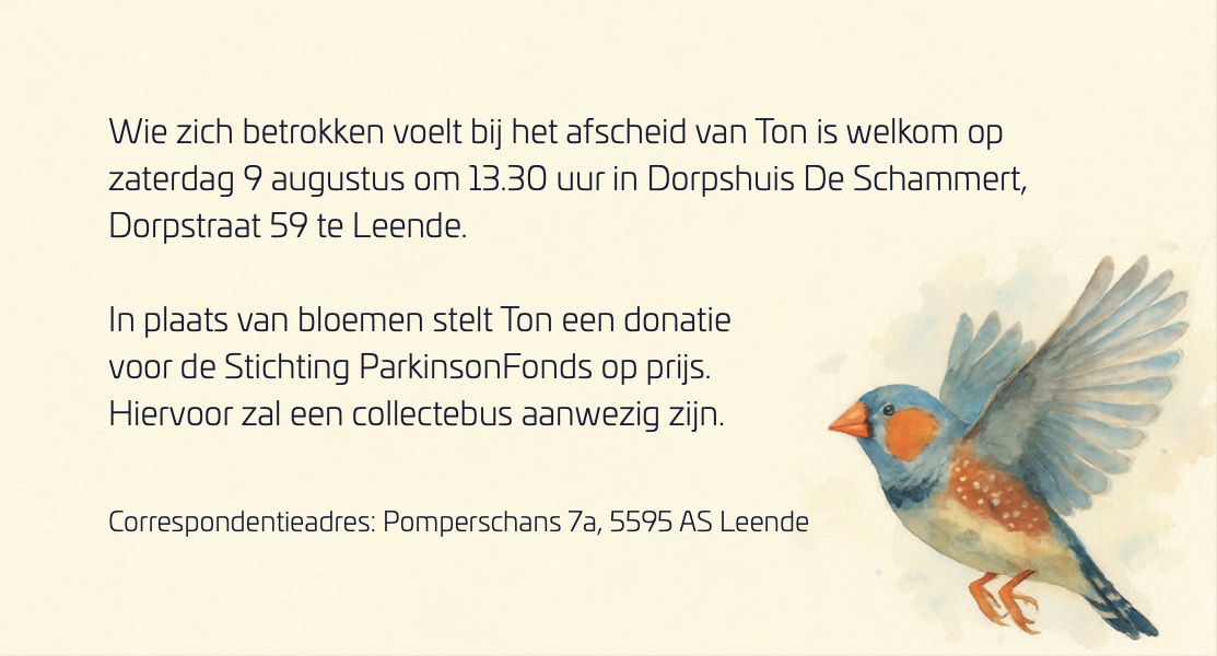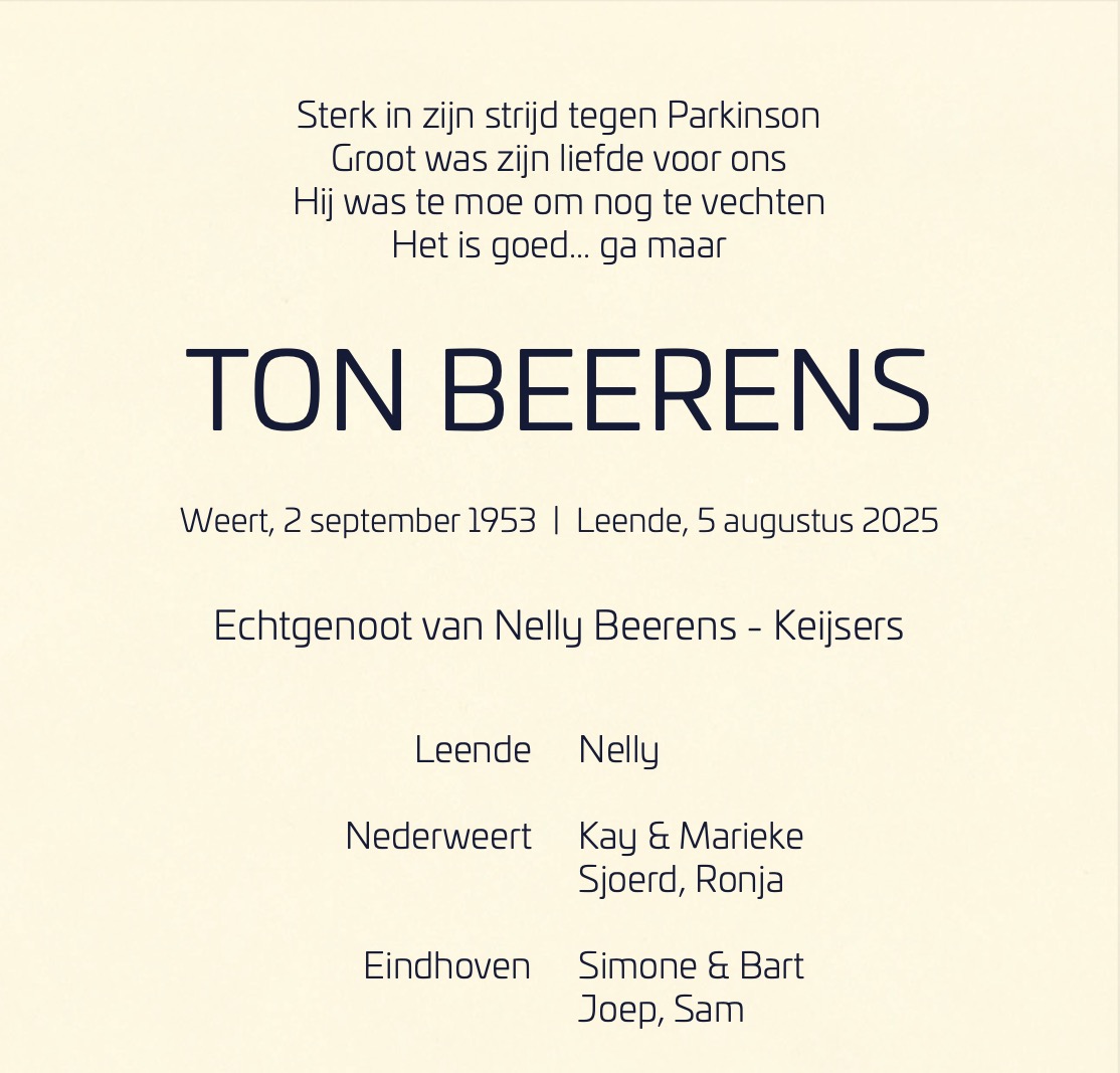 Nelly vol ongeloof lees ik net dat Ton is overleden, gecondoleerd en heel veel sterkte gewenst. Denk nog vaak aan de gezellige tijd toen we nog buren waren. Wat hebben we altijd veel gelachen samen. Hou de mooie herinneringen aan jullie tijd samen in je gedachten en de pijn wordt dan wat gedempt.