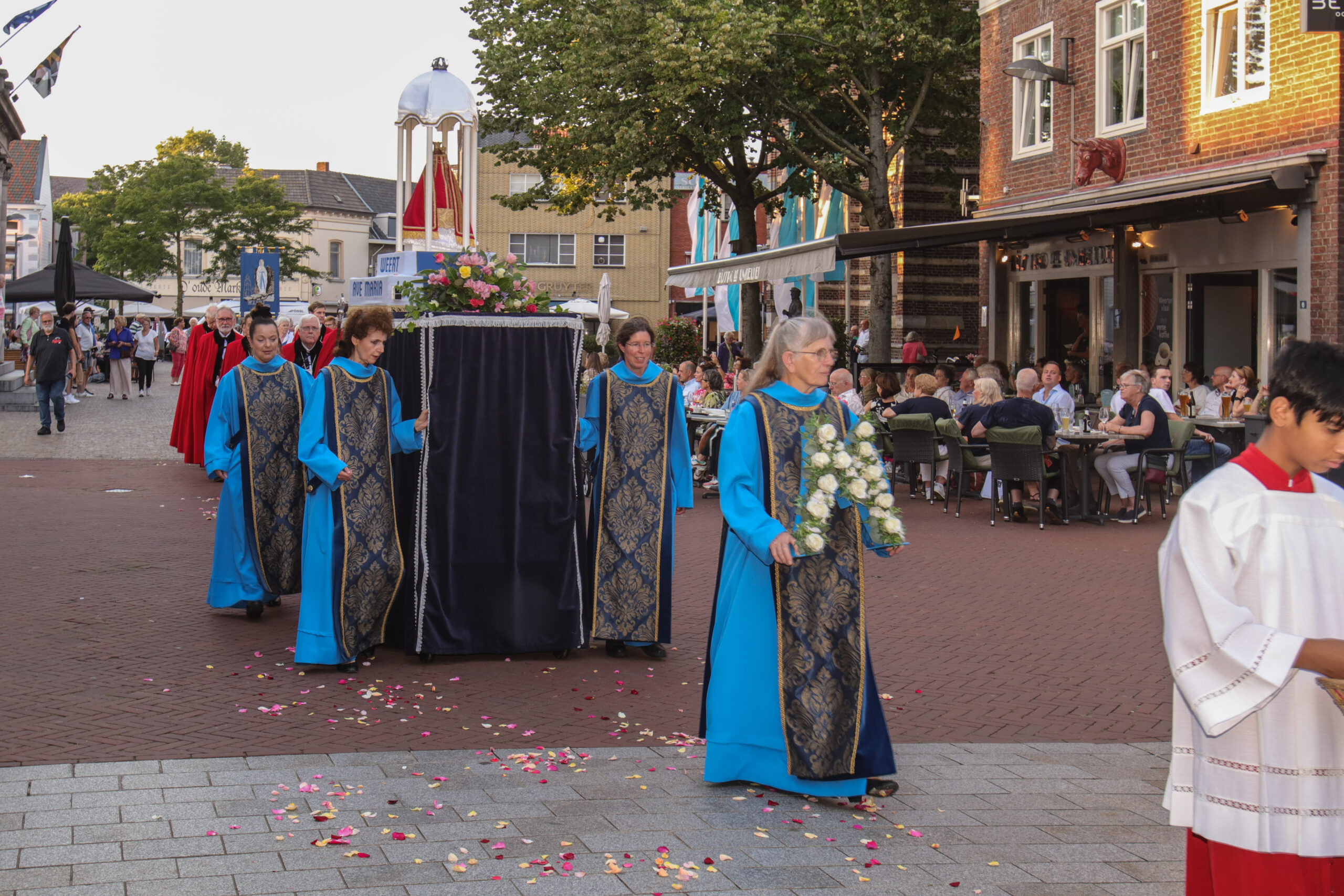 De H. Mis in de dekenale kerk start om 19.00 uur met een plechtige intochtprocessie. De dames van het draagstersgilde begeleiden het Mariabeeld samen met de pages, bruidjes, Maria’s en broedermeesters van de Venerabele Broederschap van de Miraculeuse Onse Lieve Vrouwe tot Weert tijdens deze plechtigheid. De mis wordt muzikaal opgeluisterd door het Groot Sint Martinuskoor dat de Messe brève in C van Ch. Gounod zingt. Na de Hoogmis vindt de uittochtprocessie plaats met rozenblaadjeshulde. De processie voert door de Maasstraat naar de abdij van de Zusters Birgittinessen alwaar de afsluiting is bij de Lourdesgrot.