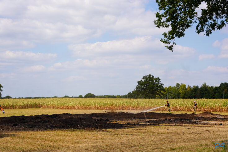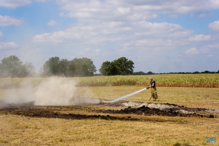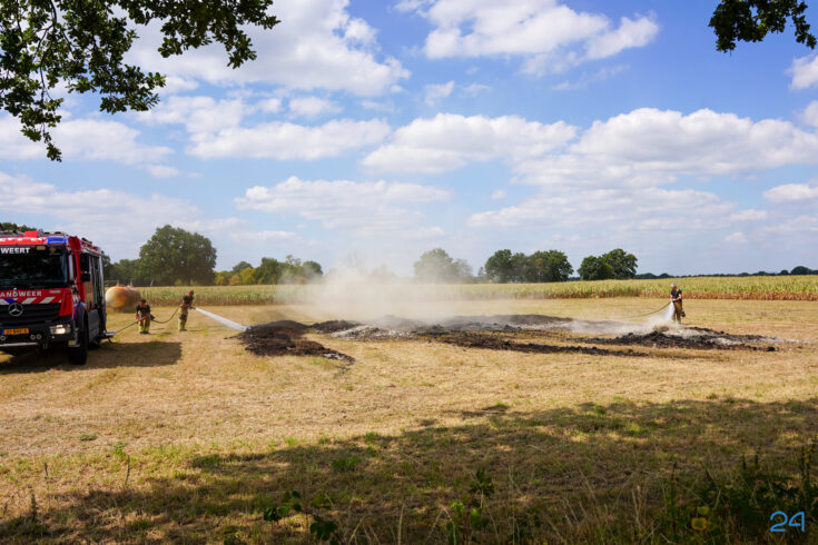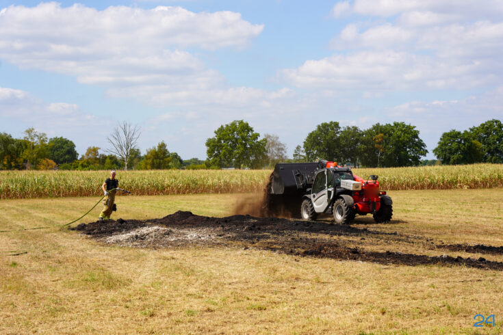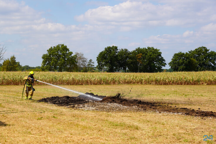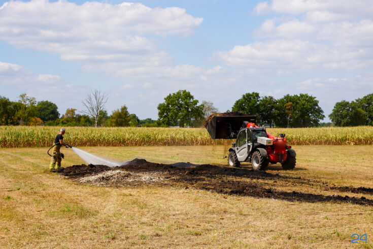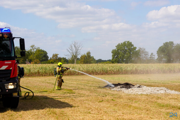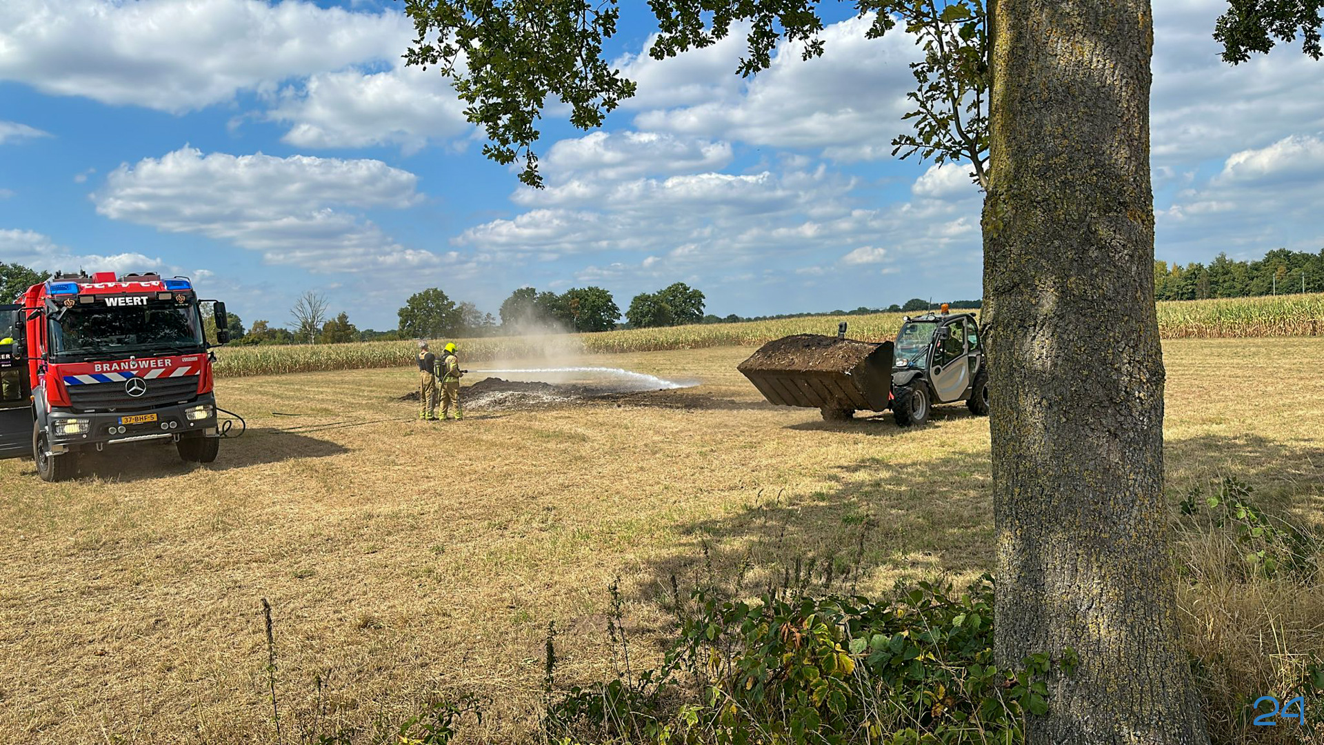 De eigenaar heeft met een Manitou de mest uit de stal op het land gereden. De brandweer kon daar de broeibrand met water blussen.