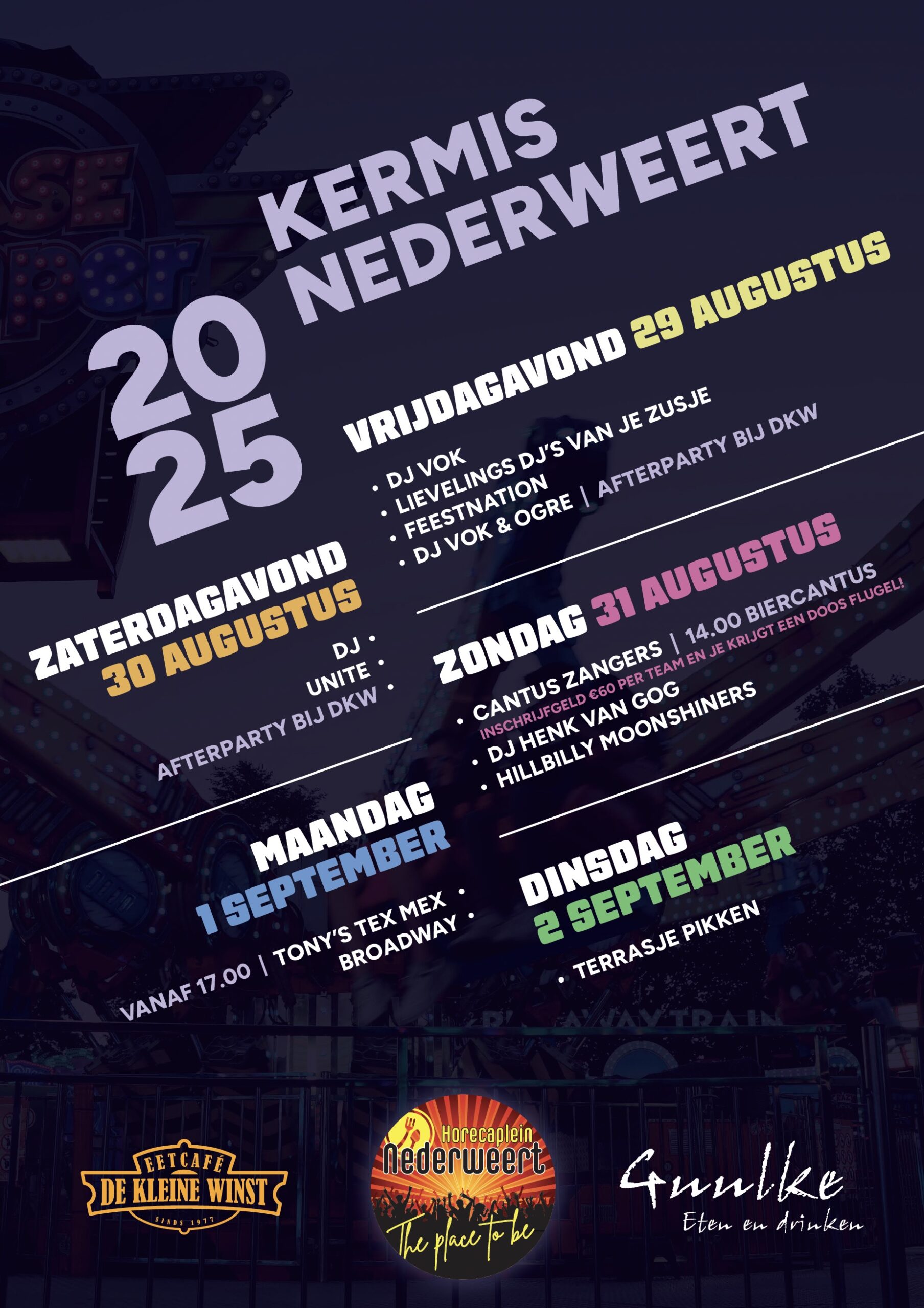 Zowel in Nederweert als in Budschop zullen weer diverse kermisattracties worden geplaatst, met vertier voor jong en oud. De Kleine Winst/Aanwinst en Guulke eten en drinken zorgen ervoor dat het horecaplein alle kermisdagen weer bol zal staan van optredens voor jong en oud, met terug van weggeweest de legendarische biercantus! Kom van 29 augustus t/m 2 september 2025 naar Nederweert Kermis, kom naar het gezelligste horecaplein van Nederland, the place to be! Alle dagen gratis entree.