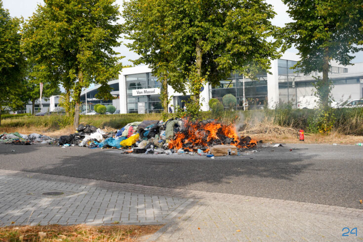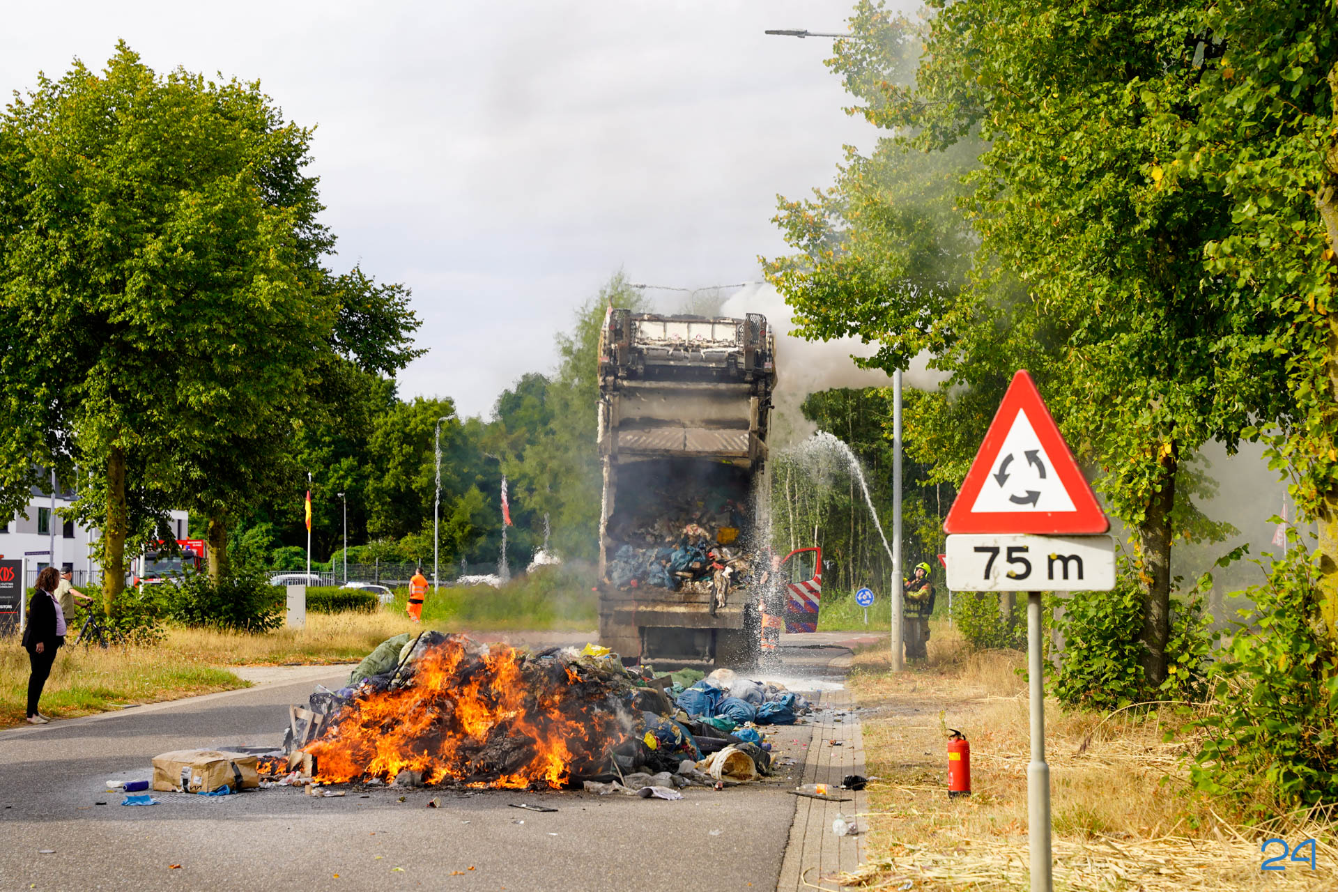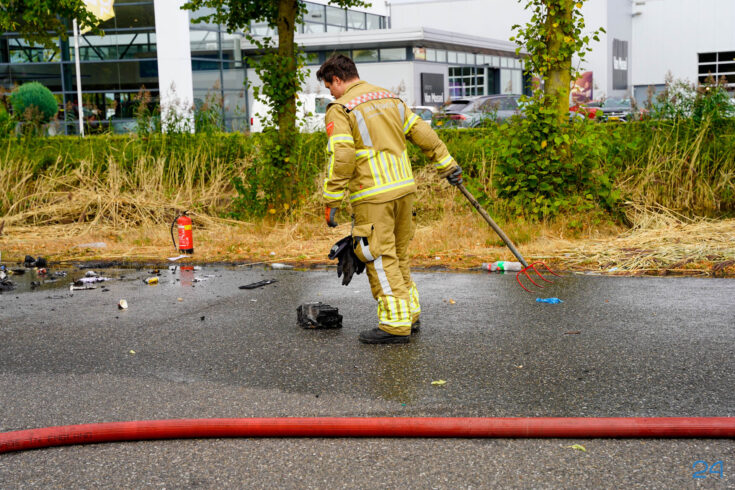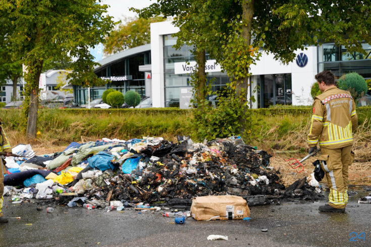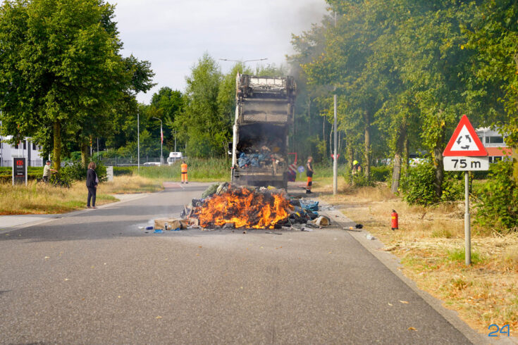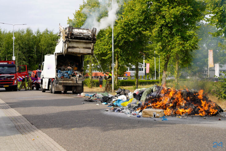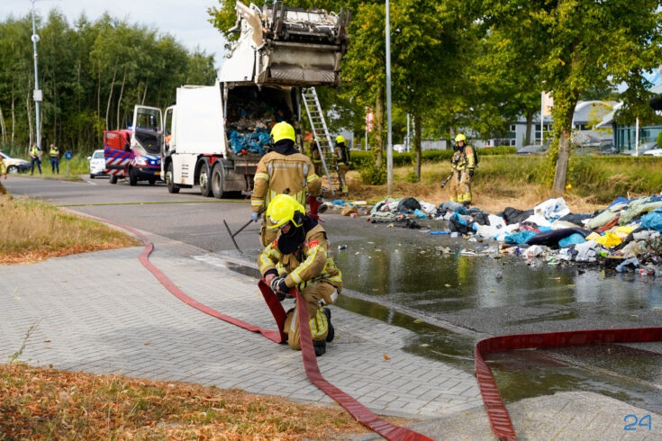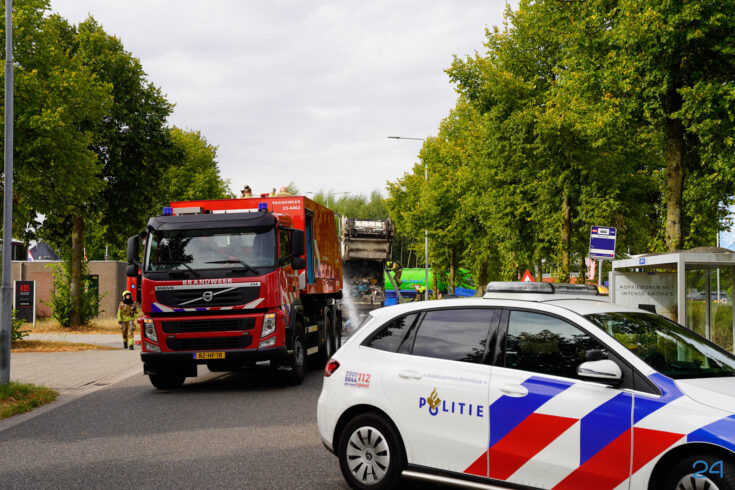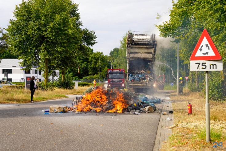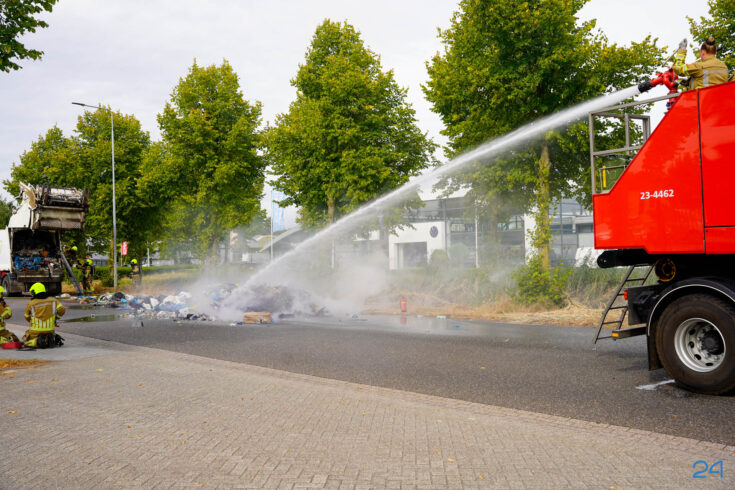 Bij aankomst had de chauffeur de lading al op straat geloosd, waardoor de brandweer het vuur snel onder controle kreeg. De smeulende resten zijn met harken uit elkaar gehaald om volledig te kunnen blussen. De brand bleek te zijn veroorzaakt door een accu die tussen het afval terecht was gekomen.