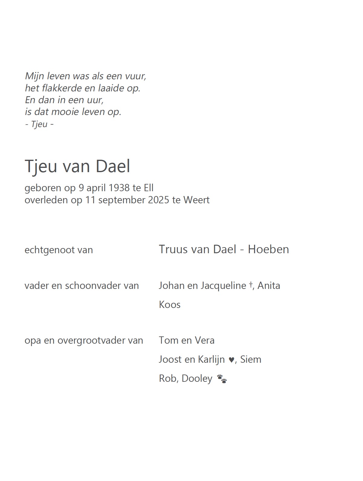 Truus, Johan, Koos, en familie, gecondoleerd en heel veel sterkte met het overlijden van Tjeu…