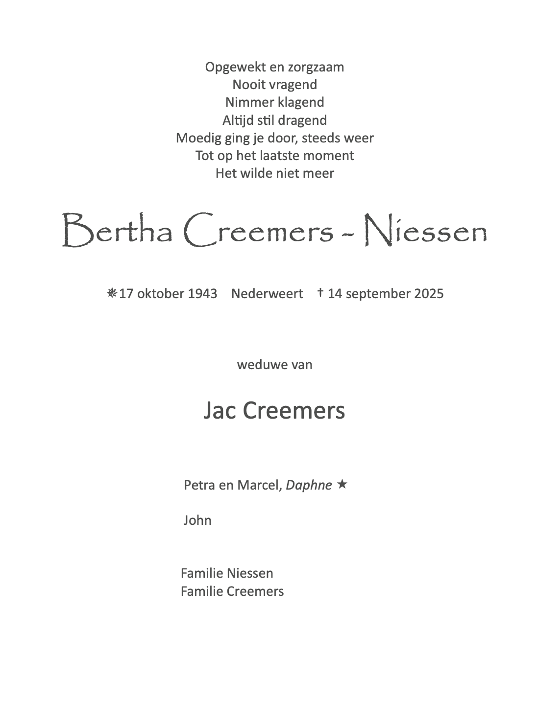 Overlijdensbericht | Bertha Creemers-Niessen †