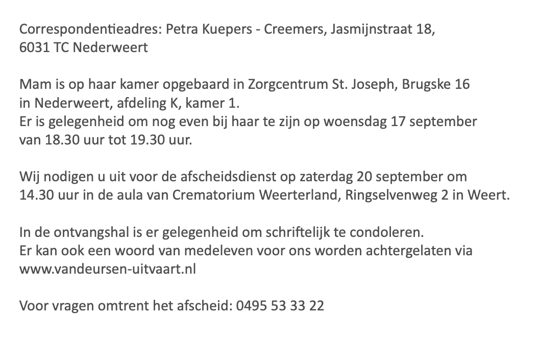 Petra en Marcel en John gecondoleerd met het overlijden van jullie moeder en schoonmoeder. Wij wensen jullie veel sterkte in deze moeilijke tijd.