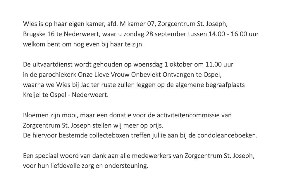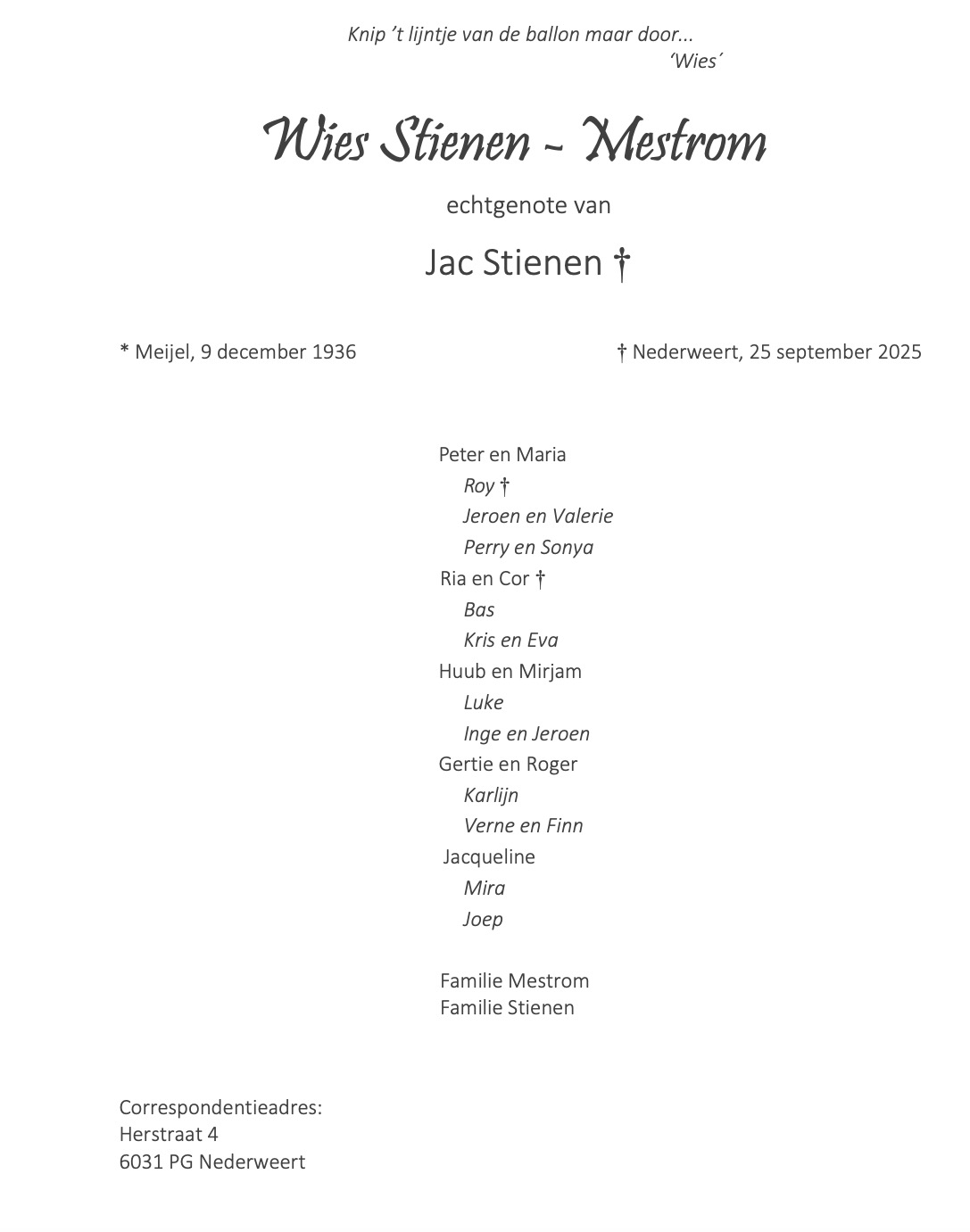 Overlijdensbericht | Wies Stienen – Mestrom †