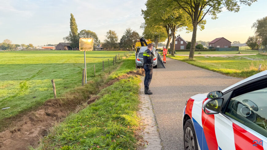 Een berger is ingeschakeld om het voertuig uit de sloot te halen. De politie neemt contact op met de eigenaar van de auto om de situatie verder te onderzoeken.