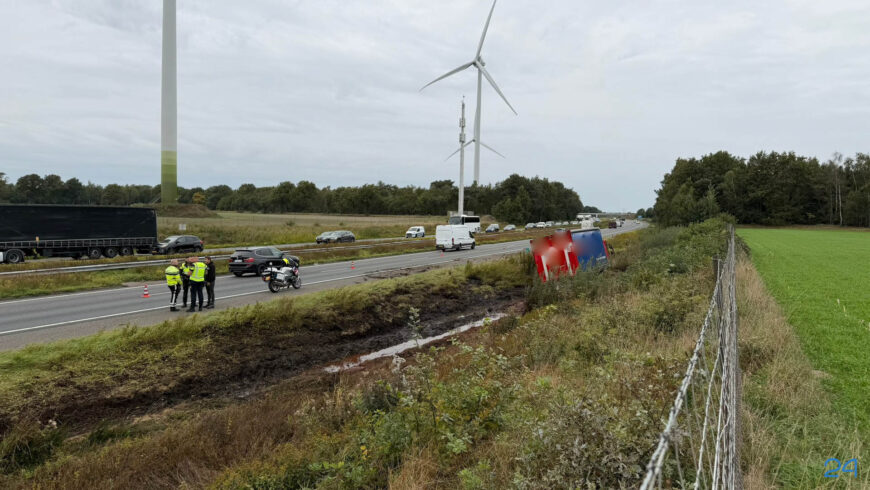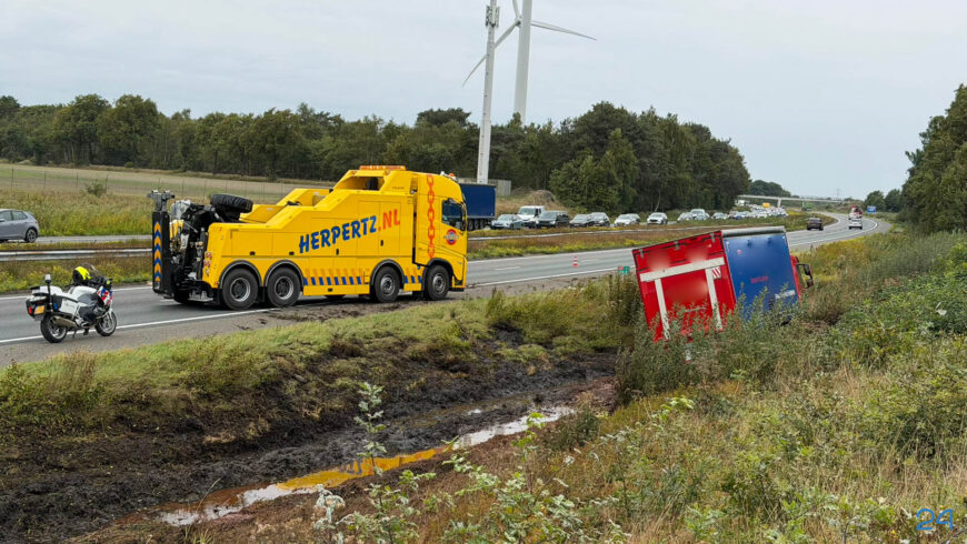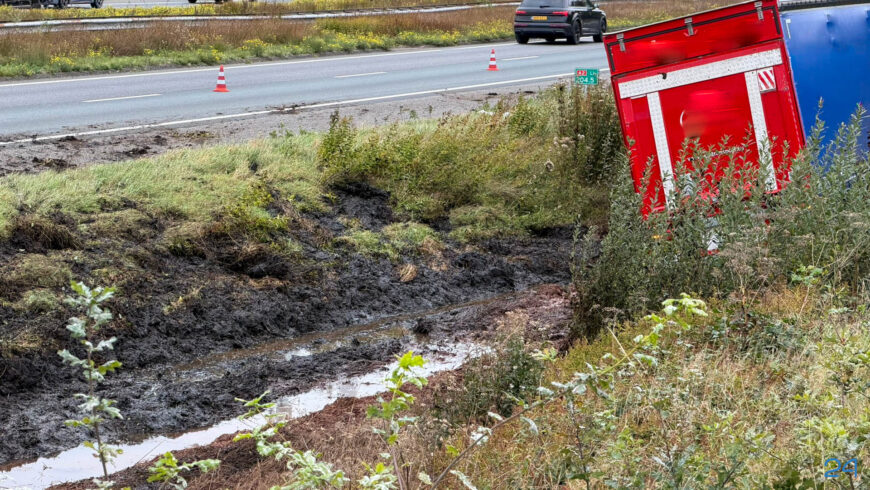 Het voertuig kwam in de berm tot stilstand. Voor zover bekend raakte de chauffeur niet gewond. Rijkswaterstaat, politie en een berger zijn ter plaatse.