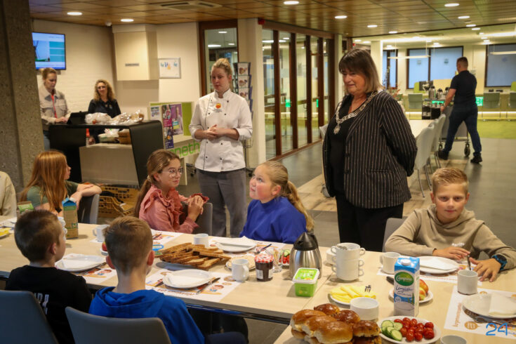 De burgemeester genoot van de leuke gesprekken en heeft iets opgemerkt: “Wat we vandaag veel gezien hebben is kaas met komkommer op brood. Die combinatie is duidelijk favoriet.” Voordat we rond 09.30 uur afsluiten bedankt ze de leerlingen voor hun komst. Maar ze wil wel nog één ding weten: “Wat heb je vandaag gegeten, wat je morgen thuis gaat eten?” Een mooie vraag om over na te denken op de fiets terug naar school.