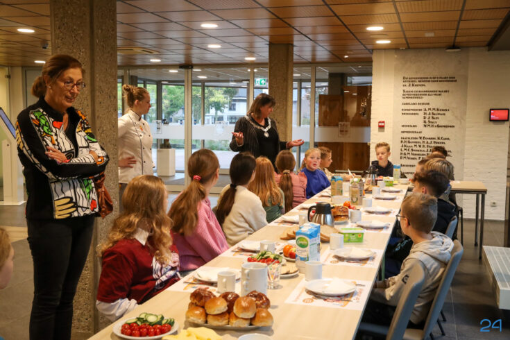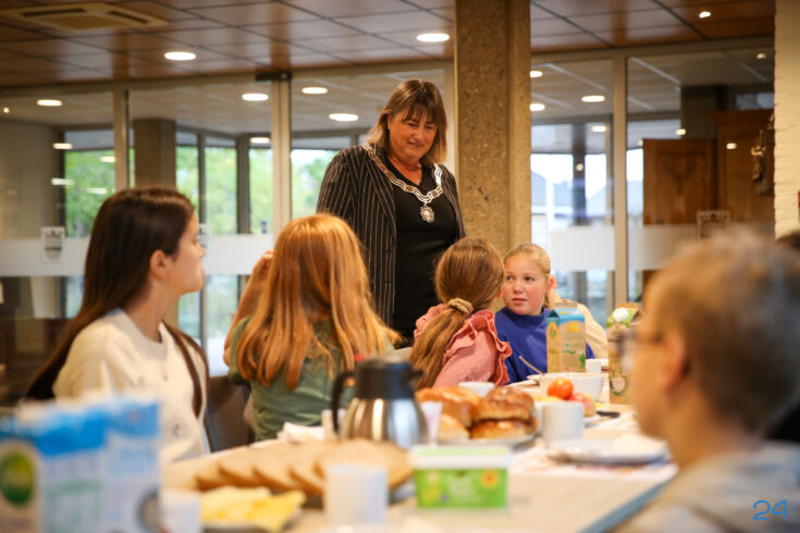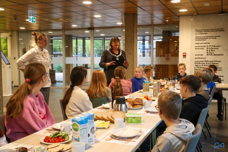 Op 7 oktober was de hal van het gemeentehuis gevuld met ontbijttafels, waarop alles klaarstond voor een gezellig ontbijt. Met onder andere volkoren tarwebolletjes, fruit, yoghurt, kaas, komkommer en cruesli wachtte burgemeester Birgit Op de Laak groep 8-leerlingen van basisschool De Tweesprong op. Zij mochten dit jaar met haar en wethouders Jorik Franssen en Boris Meessen genieten van het Burgemeestersontbijt.