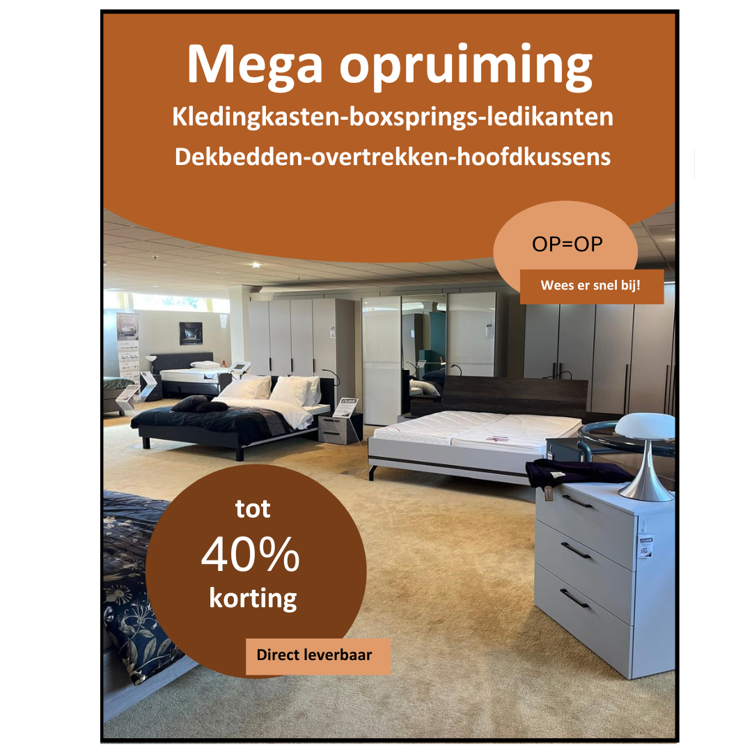 In de showroom in Nederweert vind je nu kledingkasten, boxsprings, ledikanten, dekbedden, overtrekken en hoofdkussens met kortingen tot wel 40%. Veel producten zijn direct leverbaar, maar let op: op = op.