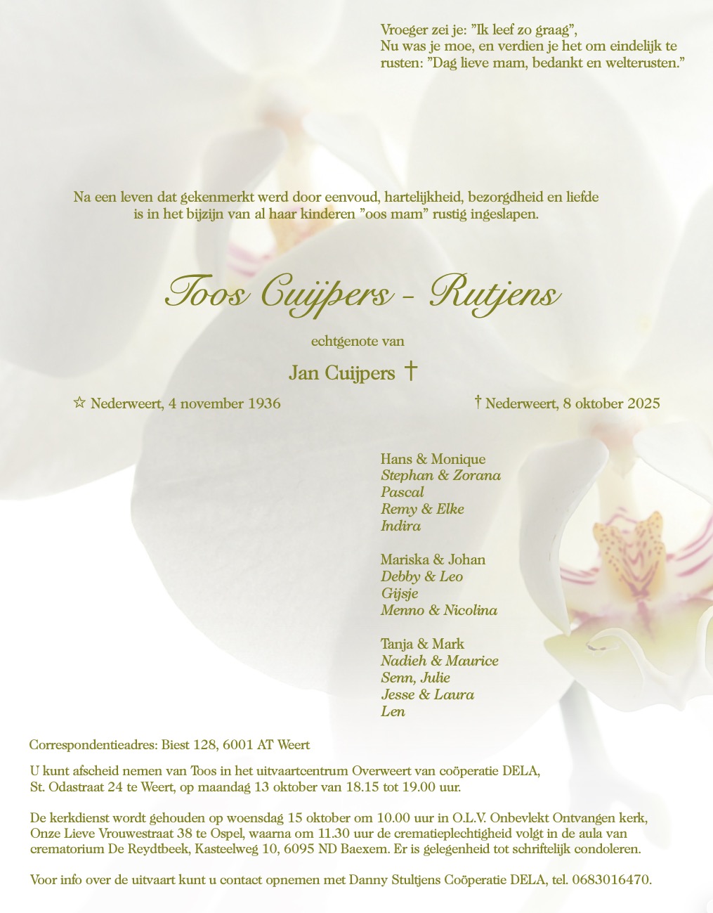 Overlijdensbericht | Toos Cuijpers – Rutjens †