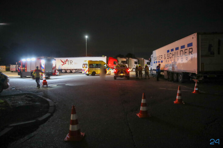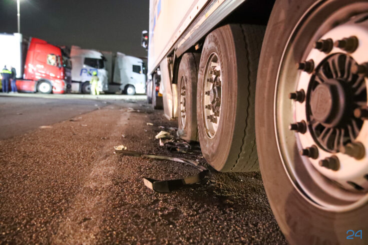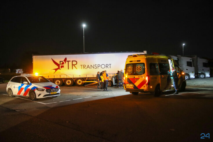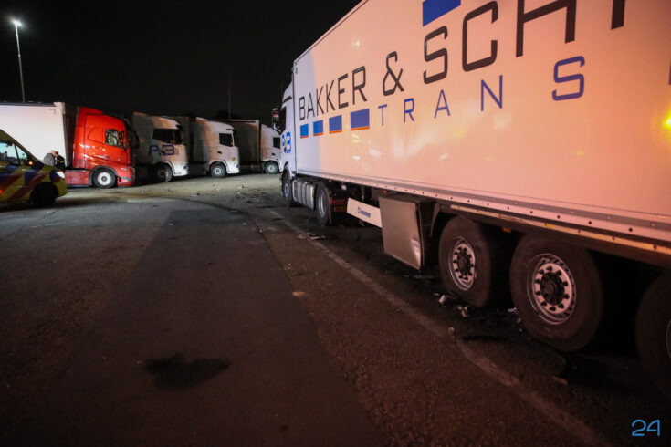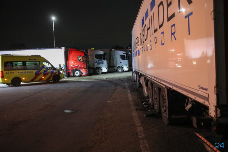 Op de parkeerplaats achter het restaurant door schampte de auto eerst een vrachtwagen met oplegger, waarna het voertuig tot stilstand kwam tegen een tweede vrachtwagen met oplegger.