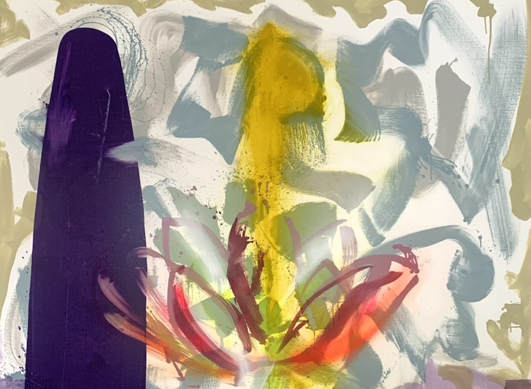 “Op de academie was het een soort “surrealistisch automatisch schrift”. Later werden deze tekens een gesprek met mijn overleden moeder. Ik schilderde monumentale vormen, die me deden denken aan grafstenen, als ondergrond voor de tekens. Nu, veertig jaar later, voel ik dat deze tekens nog steeds levendig zijn evenals de tekens van de energiebanen uit de oude chakraleer. Gekleurde spiralen en grove tekens die om een energie-kern dansen lijken tot ‘verlichting’ te komen. De combinatie met het op zoek gaan naar de energie banen die in mijn eigen lichaam zitten, vanuit de oude chakraleer, met deze onbewuste tekens die als het waren vanuit mijn tenen komen, geven weer een vernieuwend beeld. Een nieuwe serie schilderijen als resultaat.”