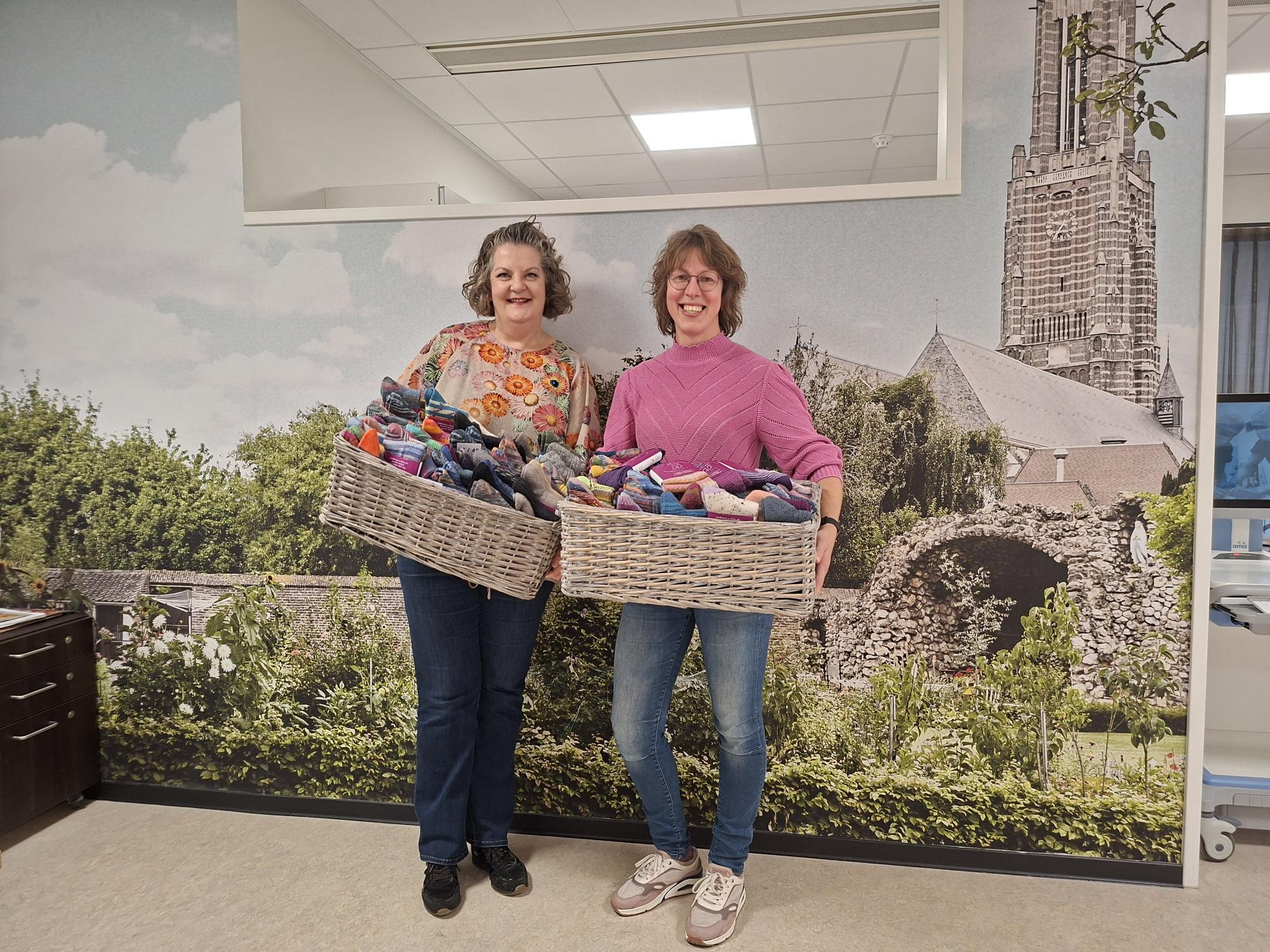 Afgelopen maandag hebben Yvonne Wulms (Madebyvonne)uit Weert en Anja Stienen (Tante Tuttebol) uit Nederweert namens de Paarse Sokken Actie maar liefst 190 paar handgebreide sokken geschonken aan de patiënten van de oncologische dagbehandeling van het SJG Weert.