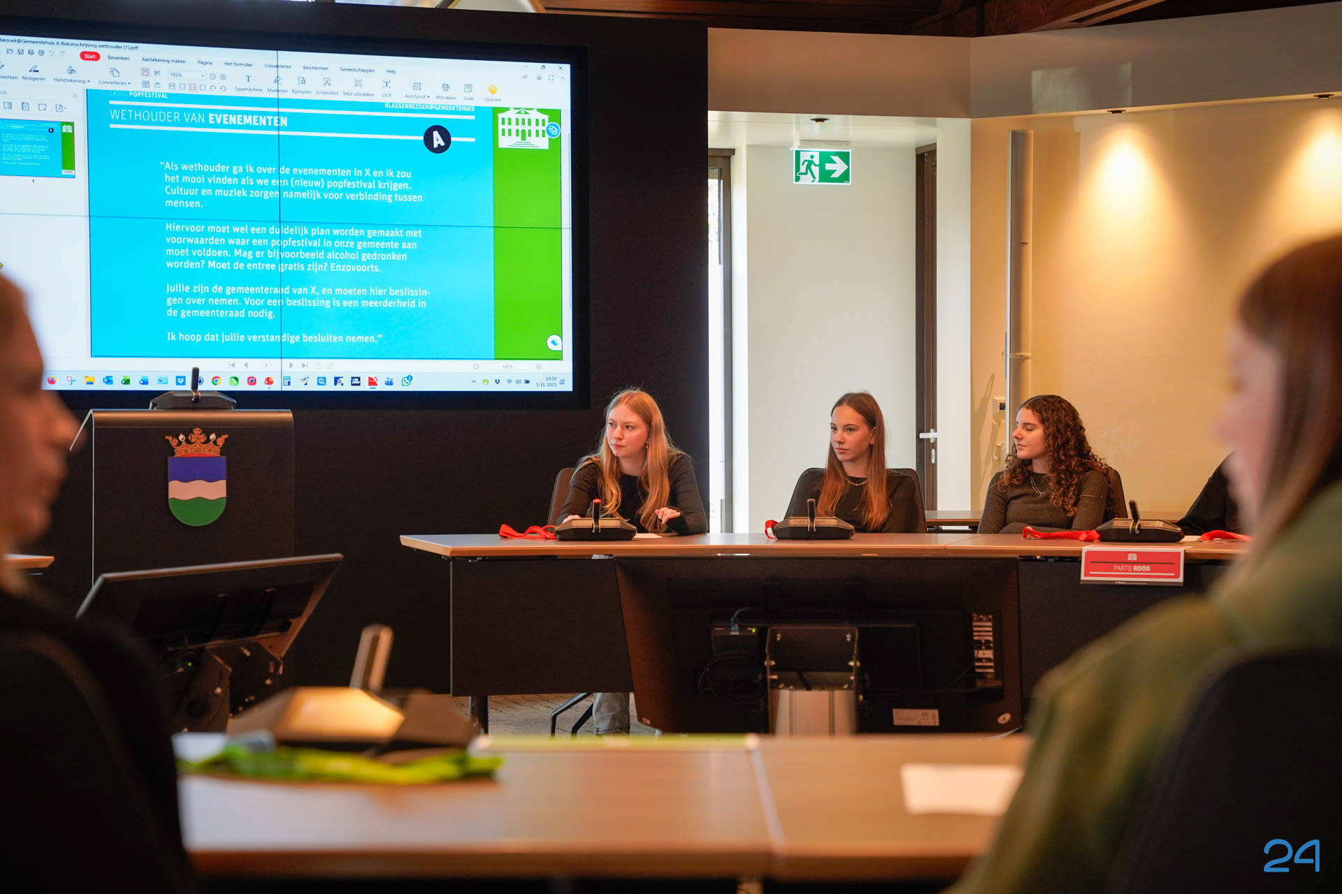 De leerlingen nemen plaats achter de microfoons in de raadzaal en krijgen meteen een interessante vraag voorgelegd: ‘Wie heeft de macht in de gemeente?’. Vervolgens richten ze politieke partijen op. Twee klasgenoten presenteren als wethouders een plan voor een festival in Nederweert. Hoe staan de politieke partijen tegenover dit voorstel?
