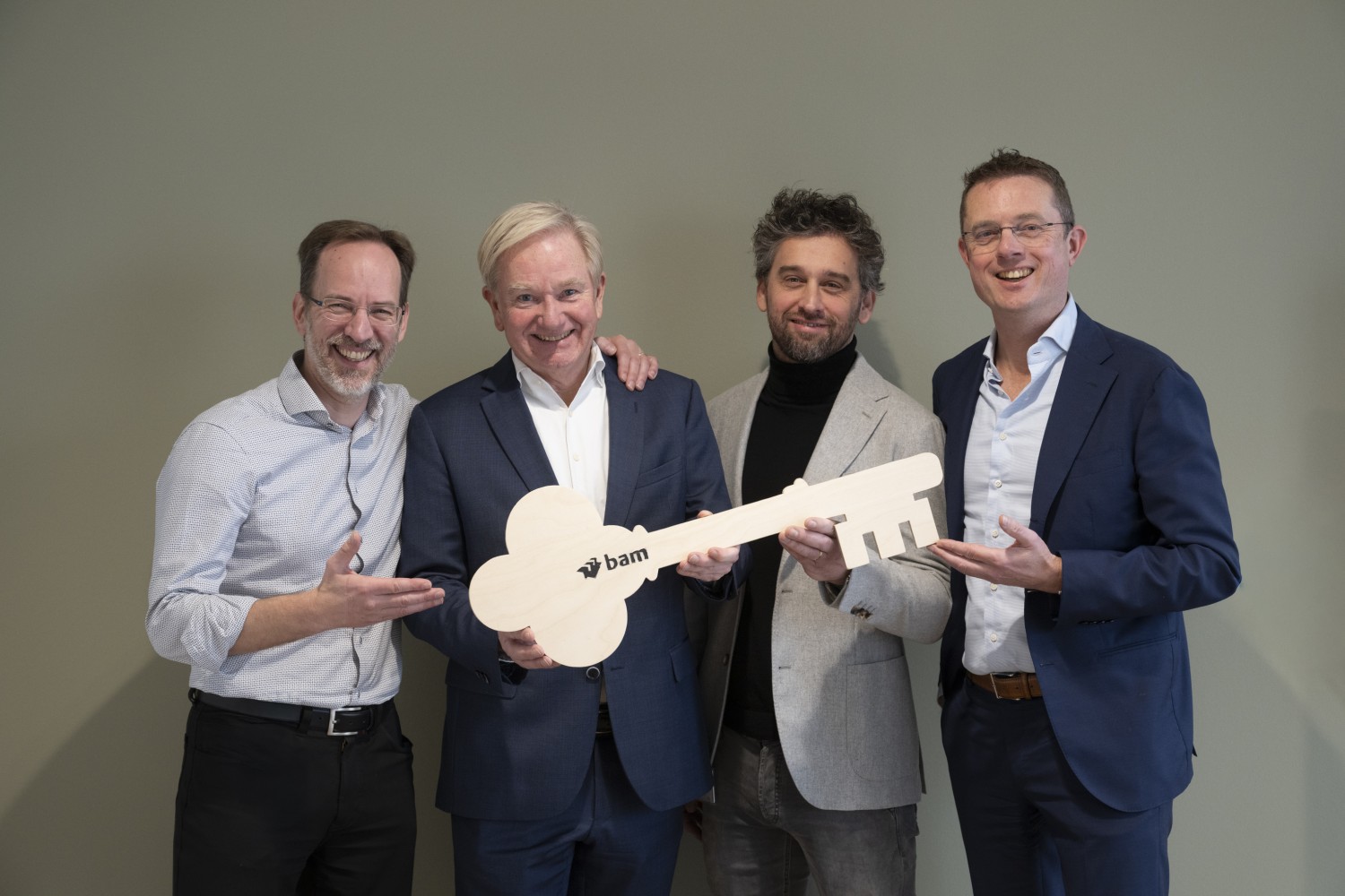 Marc Rouppe van der Voort, Will van Grimbergen, Christoph Loo en Gertjan Kamps ontvingen namens SJG Weert de symbolische sleutel van het nieuwe ziekenhuisgebouw - Foto | Alf Mertens