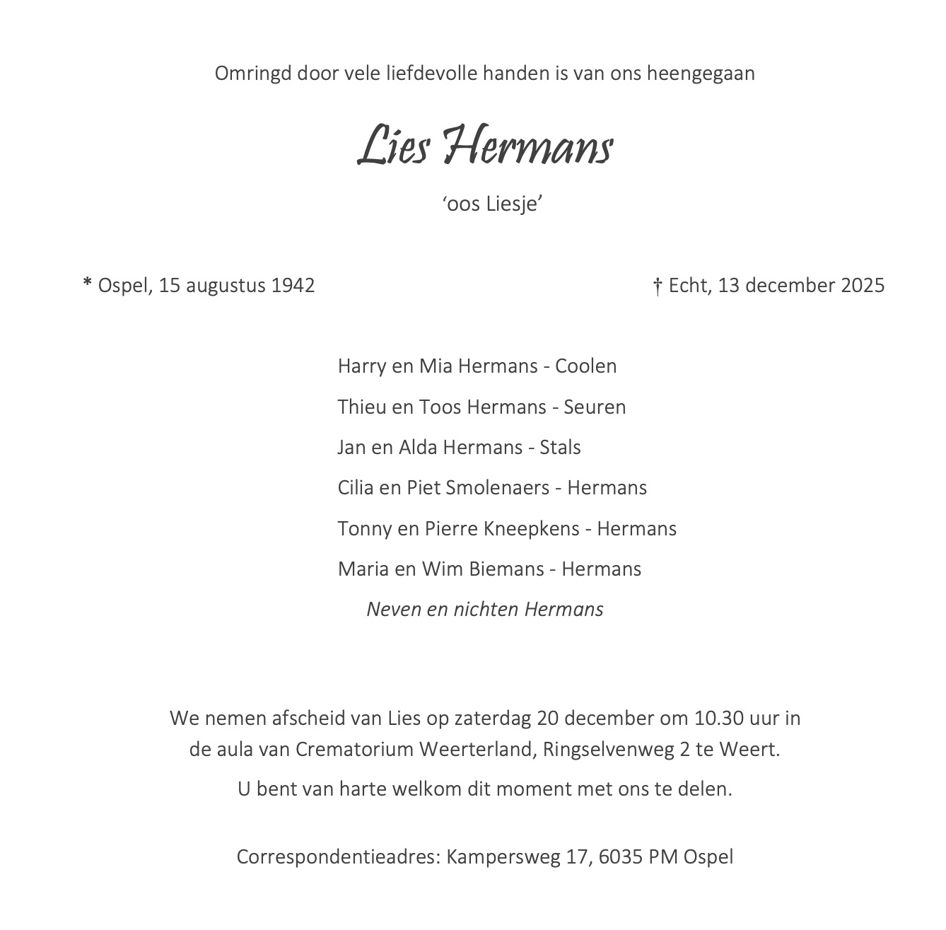 Overlijdensbericht | Lies Hermans †