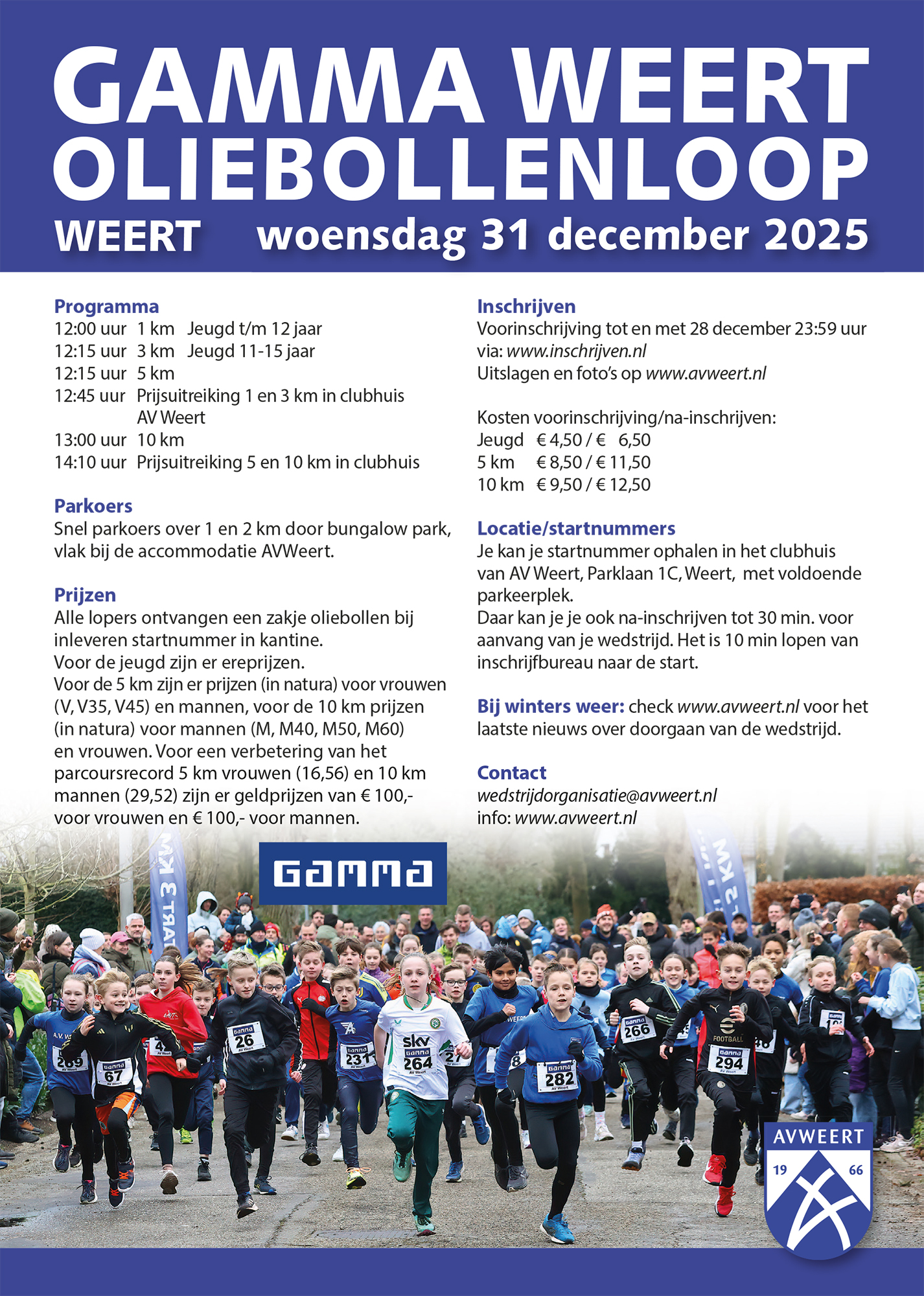 Atletiek Vereniging Weert organiseert voor de 21ste keer de traditionele Gamma Oliebollenloop op oudejaarsdag, woensdag 31 december op een stratenparkoers in het bungalowpark in Weert.