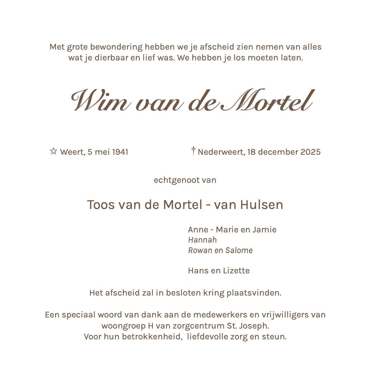 Overlijdensbericht | Wim van de Mortel †