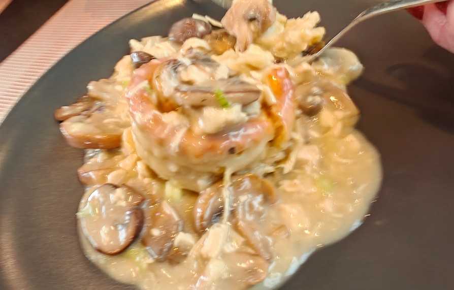 Daarna werd er gesmuld van de zelfgemaakte kippenragout met pasteitjes. Als afsluiting was er ijs met aardbeien en slagroom. Het was gezellig en er werd veel gelachen. Sommige deelnemers hadden een kerstmuts op of kerstballen aan hun oren, wat zorgde voor extra sfeer.