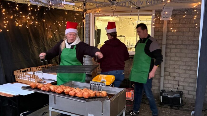 Al vroeg in de morgen ging de commissie en andere vrijwilligers aan de slag om voorbereidingen te treffen voor de oliebollenverkoop. Mensen hadden massaal gebruik gemaakt van de mogelijkheid om vooraf te bestellen. Bakken deeg werden er klaargemaakt, waarvan een gedeelte met en een gedeelte zonder rozijnen. Constant waren er een tiental vrijwilligers in de weer met deeg mengen, bakken van de oliebollen en de verkoop. Er zat niets anders op dan op je beurt wachten, ook dat was te doen, want je kon een warme kop koffie of chocomel bestellen om de tijd te doden.
