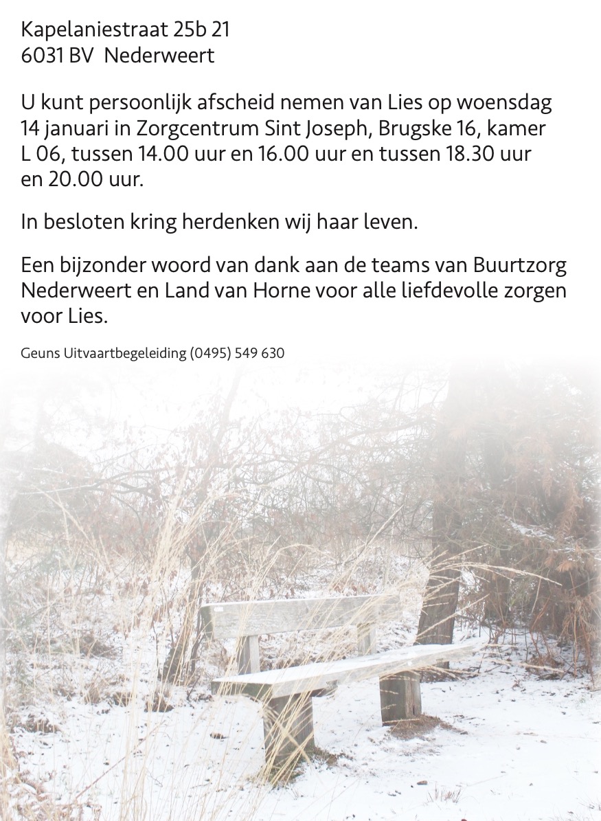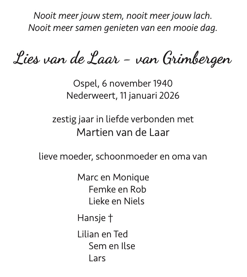 Overlijdensbericht | Lies van de Laar – van Grimbergen †
