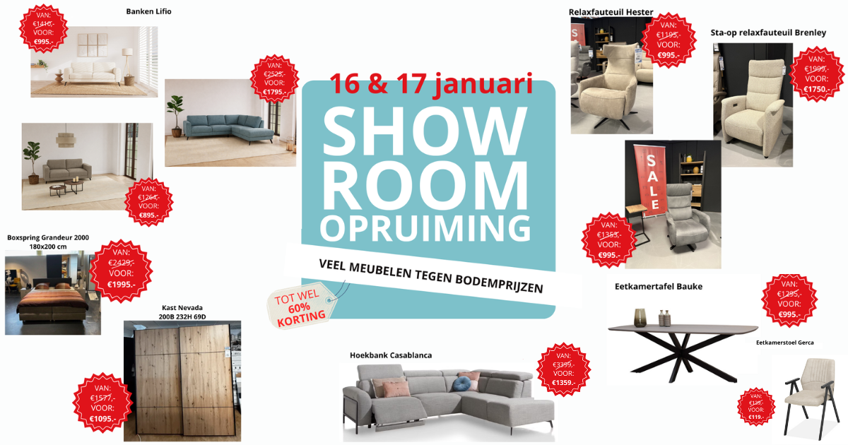 Je profiteert van tot wel 60% korting op banken, relaxfauteuils, boxsprings, kasten, tafels en stoelen. Tevens geniet je van een drankje en iets lekkers.