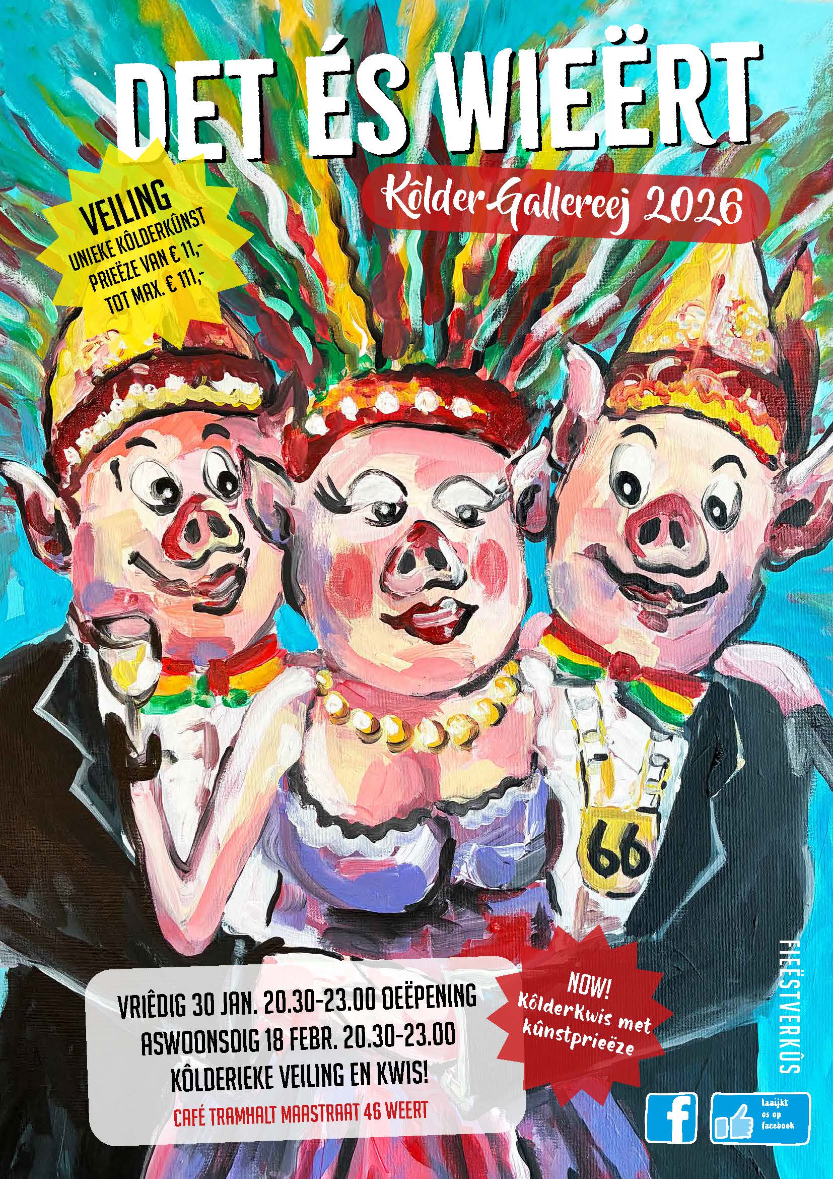 Hoogtepunt van de KolderGalereej is natuurlijk de veiling, dit jaar weer aangevuld met de ludieke Kolderkwis met mooie kunstprijzen. Ken jij Weert? Dan heb je altijd prijs en maak je kans op een gratis kolderwerk. De veilingprijzen liggen tussen de €11,- en €111,- euro, zodat iedereen met een mooi kolderwerkje naar huis kan gaan. De veiling met kwis start op 18 februari 2026 om 20.30 uur en duurt tot 23.00 uur. Een sneak preview van de kolder kunstwerken kun je hier zien.