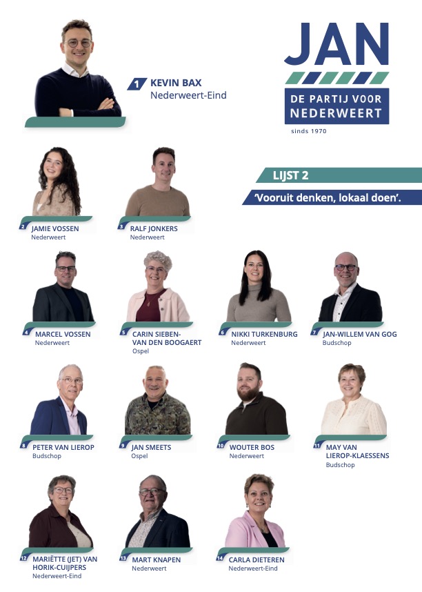 Eerder werd door de partij al bekendgemaakt dat Kevin Bax de lijsttrekker is. Kevin is ondanks zijn jonge leeftijd geen onbekende in de raad: hij heeft inmiddels al acht jaar ervaring als raadslid voor JAN. Opvallend is dat de top van de lijst wordt gevormd door een aantal jonge kandidaten: lijsttrekker Kevin Bax, Jamie Vossen en Ralf Jonkers. Daarmee laat JAN zien bewust te kiezen voor verjonging, zonder de jarenlange ervaring los te laten. Alle huidige fractieleden, die op dit moment samen vier zetels bezetten, staan bovendien opnieuw op de kandidatenlijst. Daarnaast zien we ook een aantal nieuwe gezichten op de lijst. En oud-wethouder Carla Dieteren staat als lijstduwer achter het team.