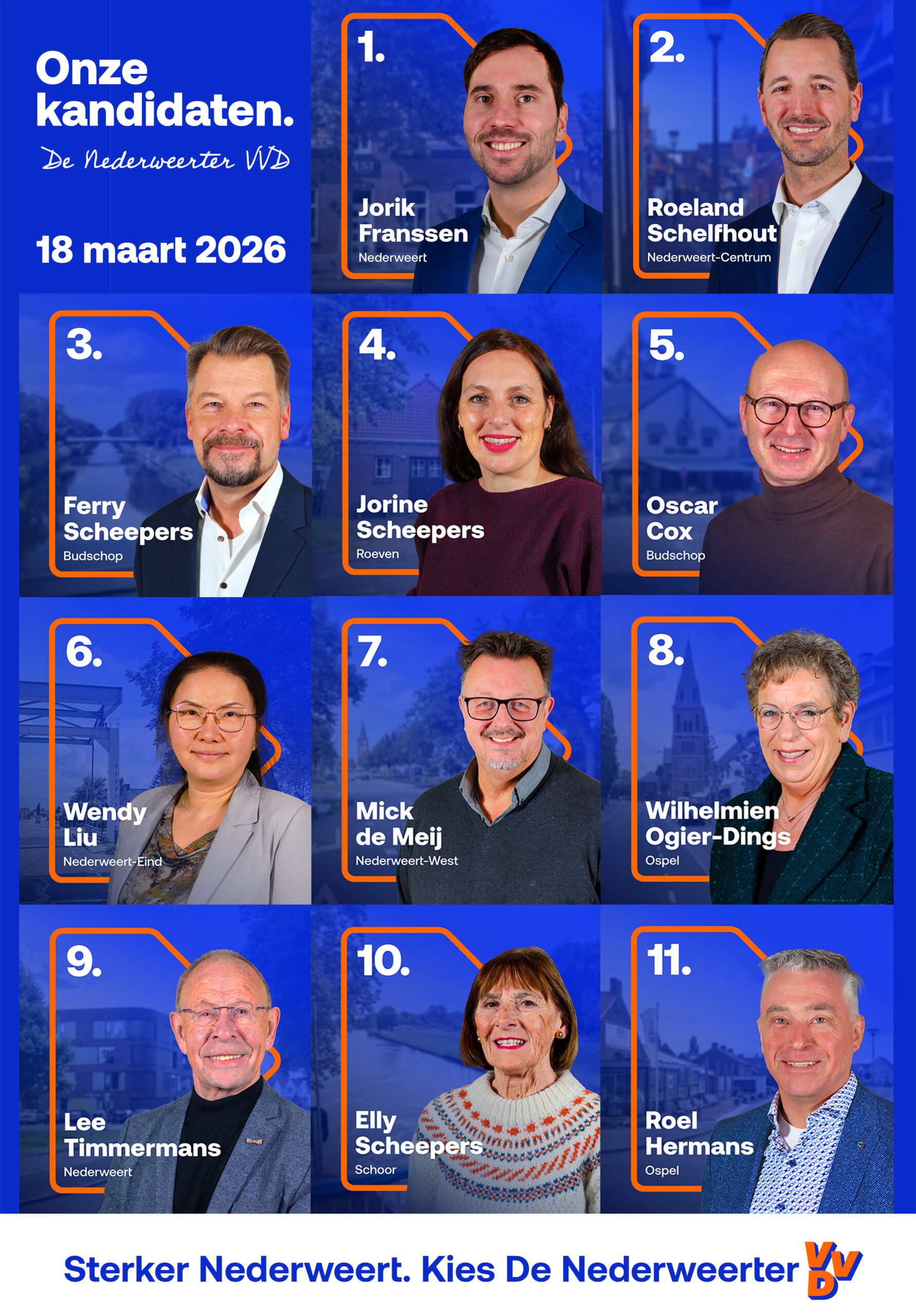 De Nederweerter VVD zet zich in voor een sterker Nederweert en vertelt de komende weken hoe ze wil bijdragen aan de toekomst van onze gemeente. Met deze kandidatenlijst van 11 betrokken inwoners zet De Nederweerter VVD koers richting de komende raadsperiode met realisme, lokale trots en ambitie.