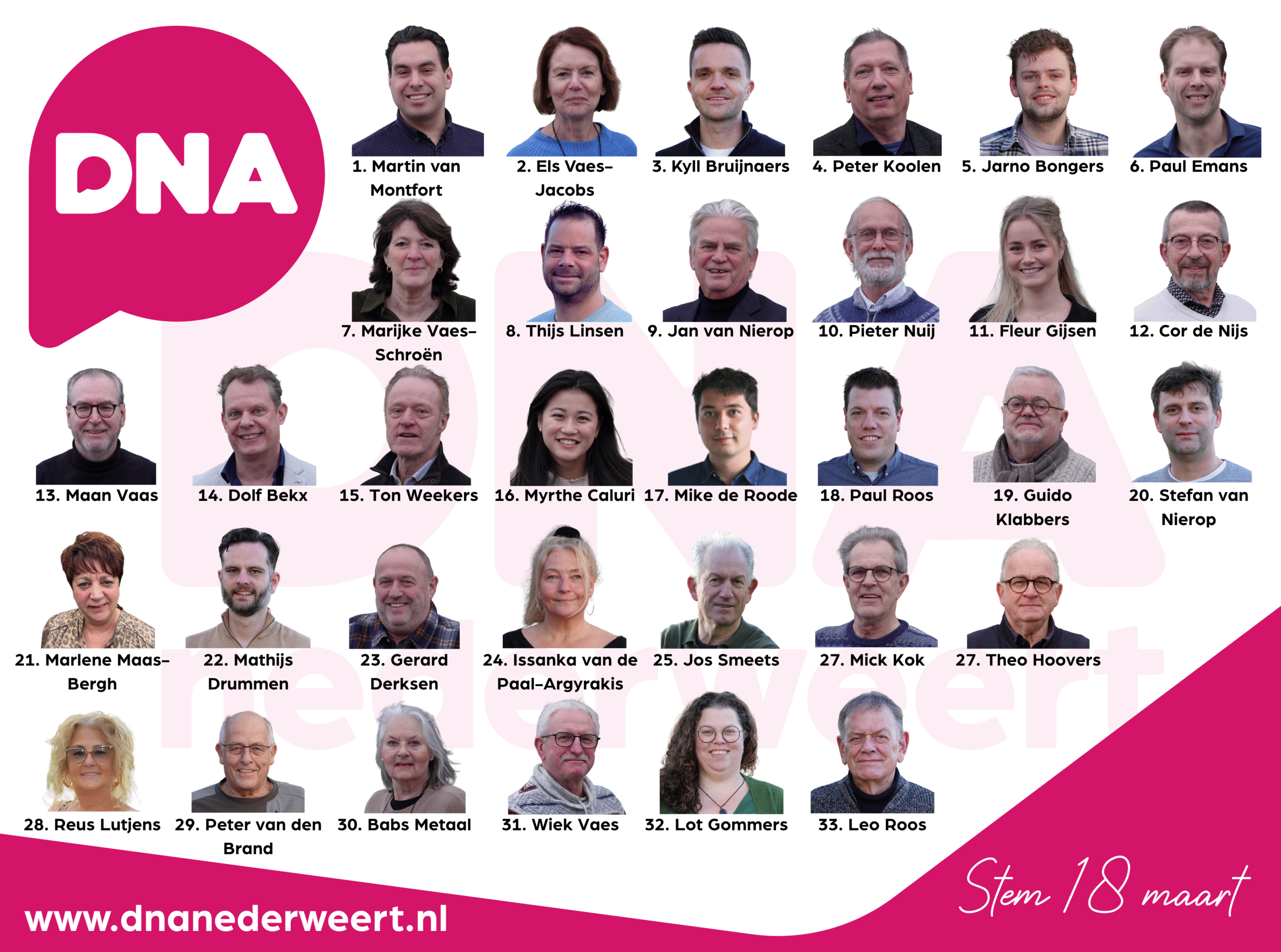 DNA Nederweert presenteert haar kandidaten voor de gemeenteraadsverkiezingen van 18 maart 2026. De lijst bestaat uit een diverse groep van 33 personen, met een groot aantal nieuwe gezichten.