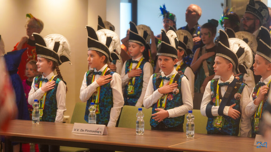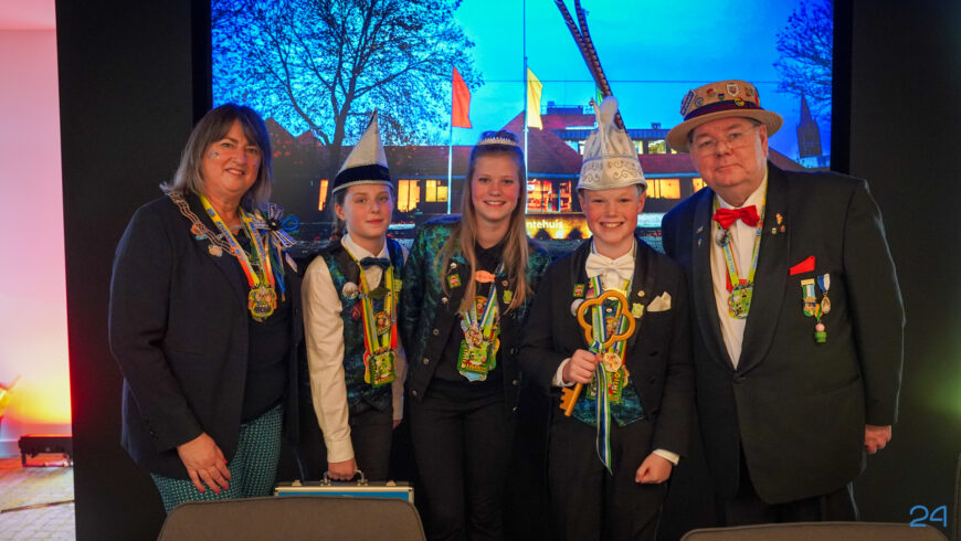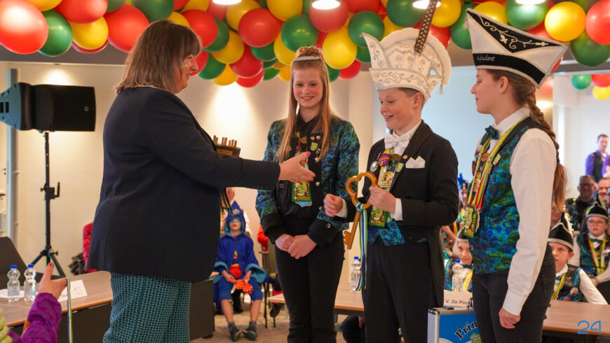 Daarna was het tijd voor de officiële sleuteloverdracht. Maar niet voordat alle jeugdprinsen een hartige woordje tot het gemeentebestuur hadden gesproken. Jeugdprins Rens I en jeugdprinses Sterre van J.K.V. De Krielkes, en Jeugdprins Jip I en jeugdprinses Fenna van de Jong Vlikkestaekers, kregen een medaille met de sleutel van de ‘fietsekelder’. Vervolgens kregen Jeugdprins Teun I en jeugdprinses Tess van V.V. De Pinmaekers uit handen van de burgemeester de sleutel van het ‘achterpörtje’ overhandigd. Hiermee heeft de jeugd de macht in handen. In ieder geval tot vanavond, want dan krijgt Prins Joost II van V.V. de Pinmaekers de sleutel van de voordeur van het gemeentehuis.