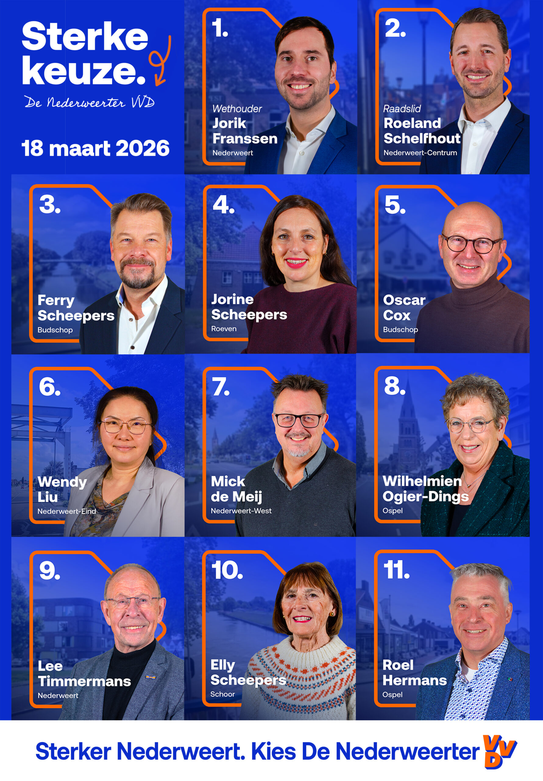 De Nederweerter VVD combineert bestuurlijke ervaring met nieuwe energie. We weten hoe de gemeente werkt, maar blijven vooral nuchter en praktisch: we doen wat nodig is voor Nederweert. We bouwen voort op wat de afgelopen jaren is bereikt en pakken aan wat beter moet. De Nederweerter VVD staat klaar om verantwoordelijkheid te blijven nemen en verder te bouwen aan een gemeente die vooruit durft te kijken. Betrouwbaar en verantwoord, vernieuwend waar het kan. We zetten koers richting de komende raadsperiode met realisme, lokale trots en ambitie. Altijd met oog voor onze dorpen, buurten en het buitengebied.