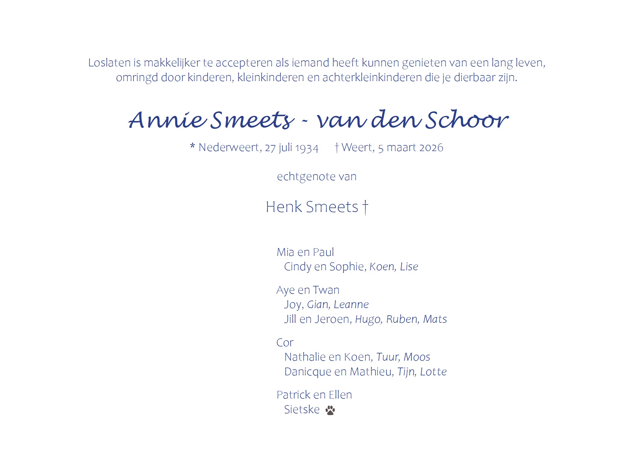 Overlijdensbericht | Annie Smeets – van den Schoor †