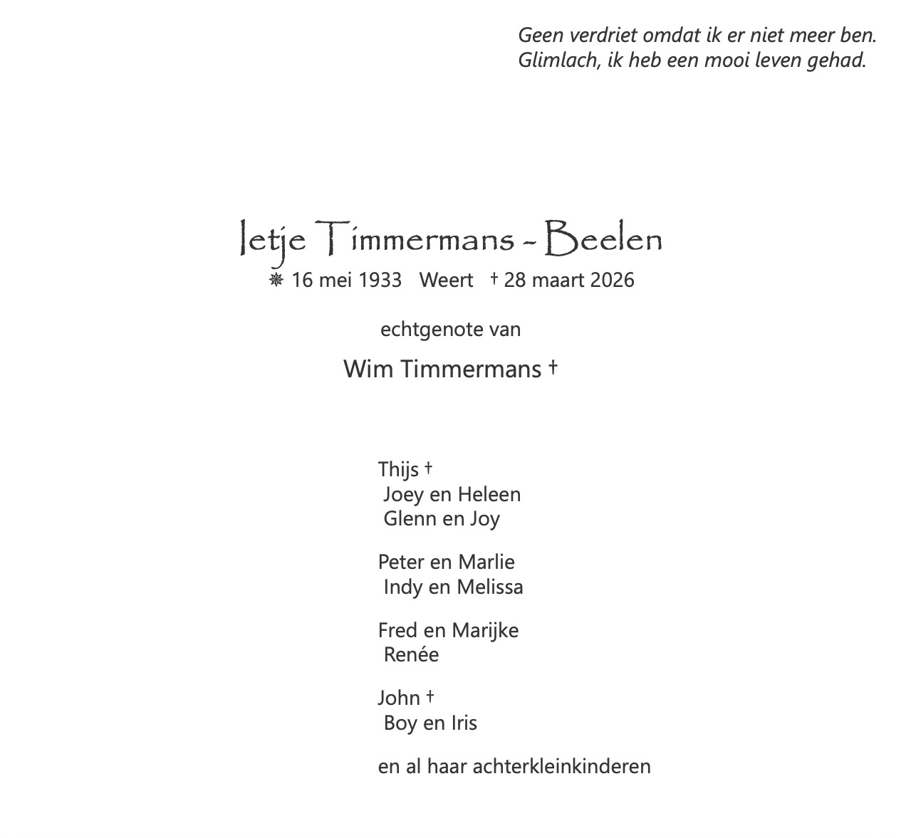 Rouwadvertentie | Ietje Timmermans – Beelen †