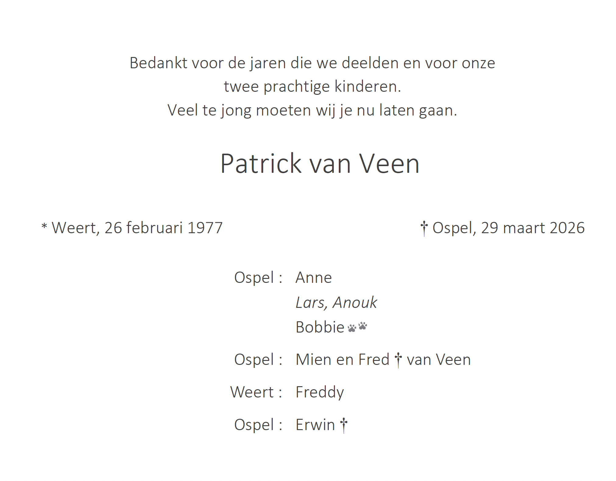 Lieve Patrick, we laten je nu gaan. Bedankt voor alles wat je ons als gezin gegeven hebt. In onze kinderen blijf ik jou voor altijd zien.