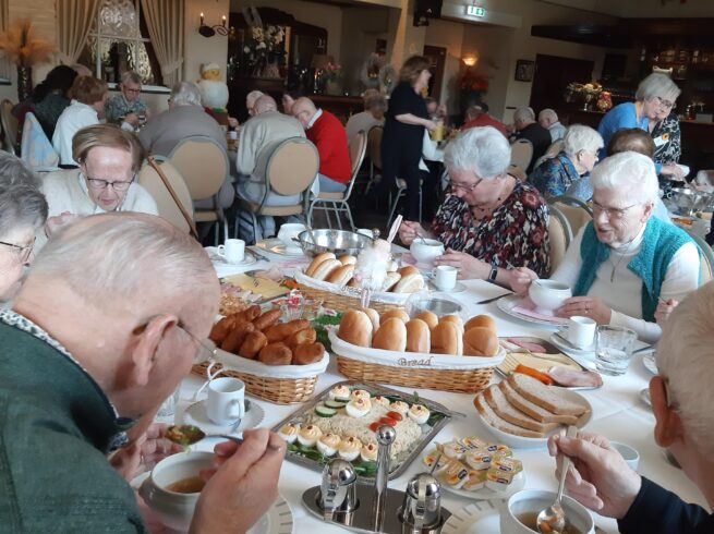 Tegen half twaalf begon het drukker te worden; de gasten en ook een aantal vrijwilligers druppelden binnen en zochten een plekje. Gasten waarvoor het niet mogelijk is om zonder begeleiding een activiteit te bezoeken, zorgden de vrijwilligers om die reden voor hand- en spandiensten. Hulp bij de jas uit- en aantrekken trekken, een plekje zoeken en ook als het nodig is, hulp bij naar het toilet gaan. De mensen van de bediening waren inmiddels druk bezig met de voorbereidingen. Mooi gedekte tafels, vrolijke eierdopjes en de huisgemaakte soep. Iedereen genoot daarna van de diverse soorten broodjes, krentenbrood, warme en koude gerechten. Ook het dessert smaakte opperbest!