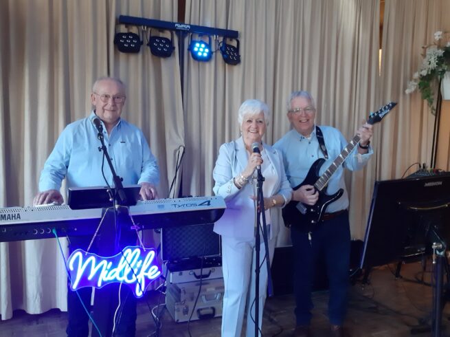 Na de lunch bracht de formatie Midlife, bestaande uit Andre, Henk en Riekie, gezellige dans- en meezingmuziek ten gehore. Hun repertoire kent bekende nummers uit de jaren zestig en zeventig, aangevuld met Nederlandse, Duitse en Limburgse muziek. Iedereen heeft genoten, gezellig gepraat en geluisterd naar elkaar. Mooi en aandoenlijk om te horen en te zien.