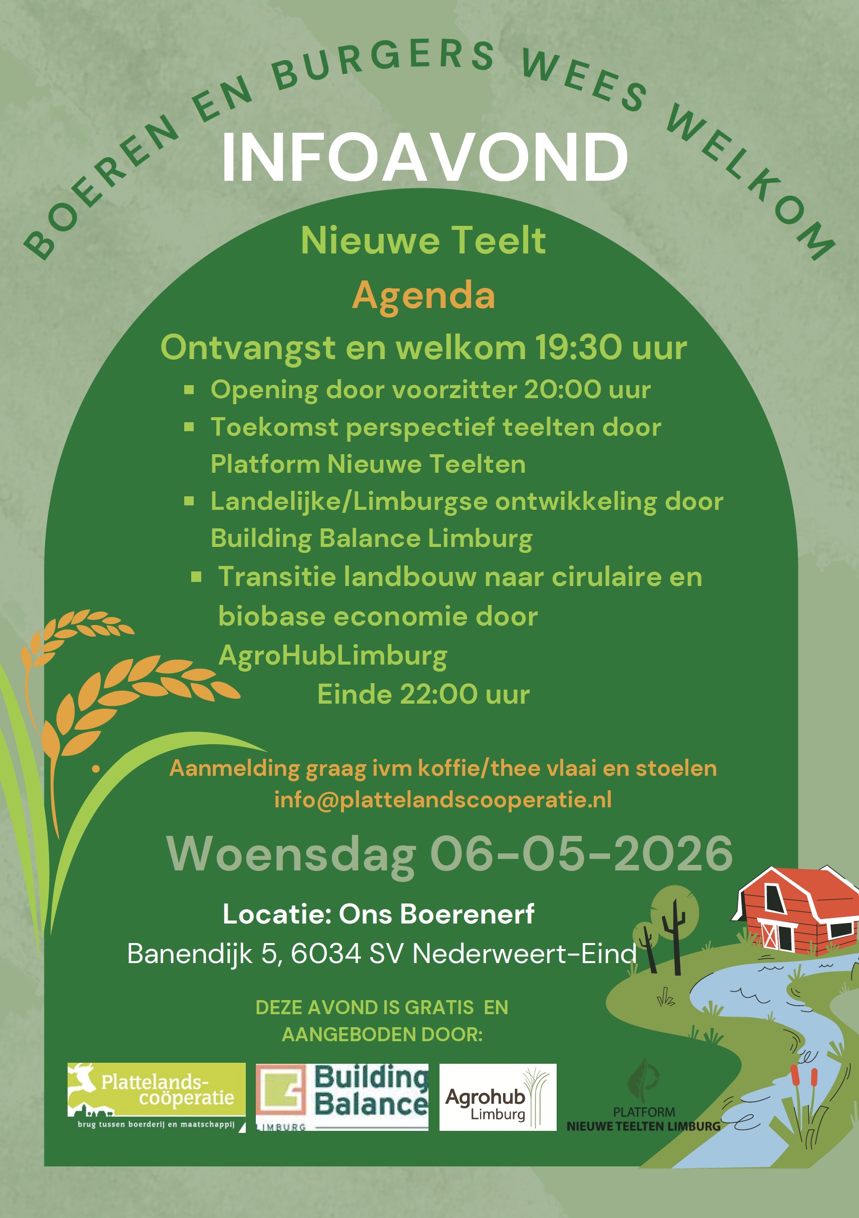 Boeren en burgers zijn van harte welkom op de infoavond Nieuwe Teelt, georganiseerd door Plattelandscoöperatie Peel en Maas en Building Balance Limburg. De avond vindt plaats op woensdag 6 mei 2026 bij Ons Boerenerf, Banendijk 5, 6034 SV Nederweert-Eind. Ontvangst vanaf 19:30 uur, het programma start om 20:00 uur en eindigt om 22:00 uur.