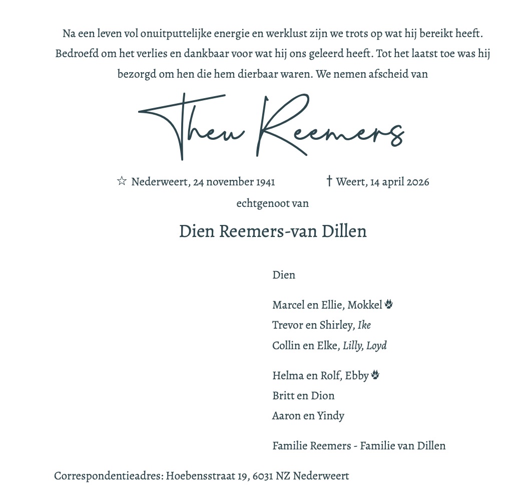 Overlijdensbericht | Theu Reemers †