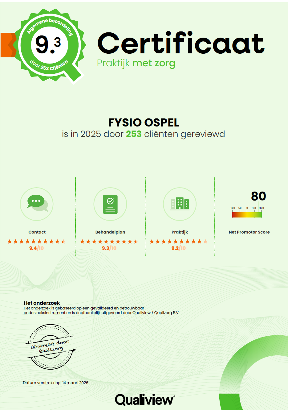 In totaal vulden 253 cliënten een beoordeling in. Daarnaast behaalde de praktijk een NPS-score van 80 op 100. Die score geeft aan in welke mate cliënten de praktijk aanbevelen aan anderen.