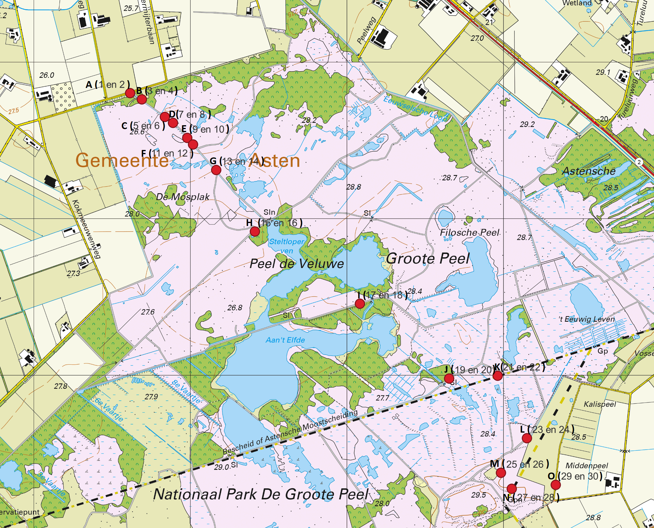 Het transect (onderzoekslijn) van 3,7 km dwars door De Groote Peel