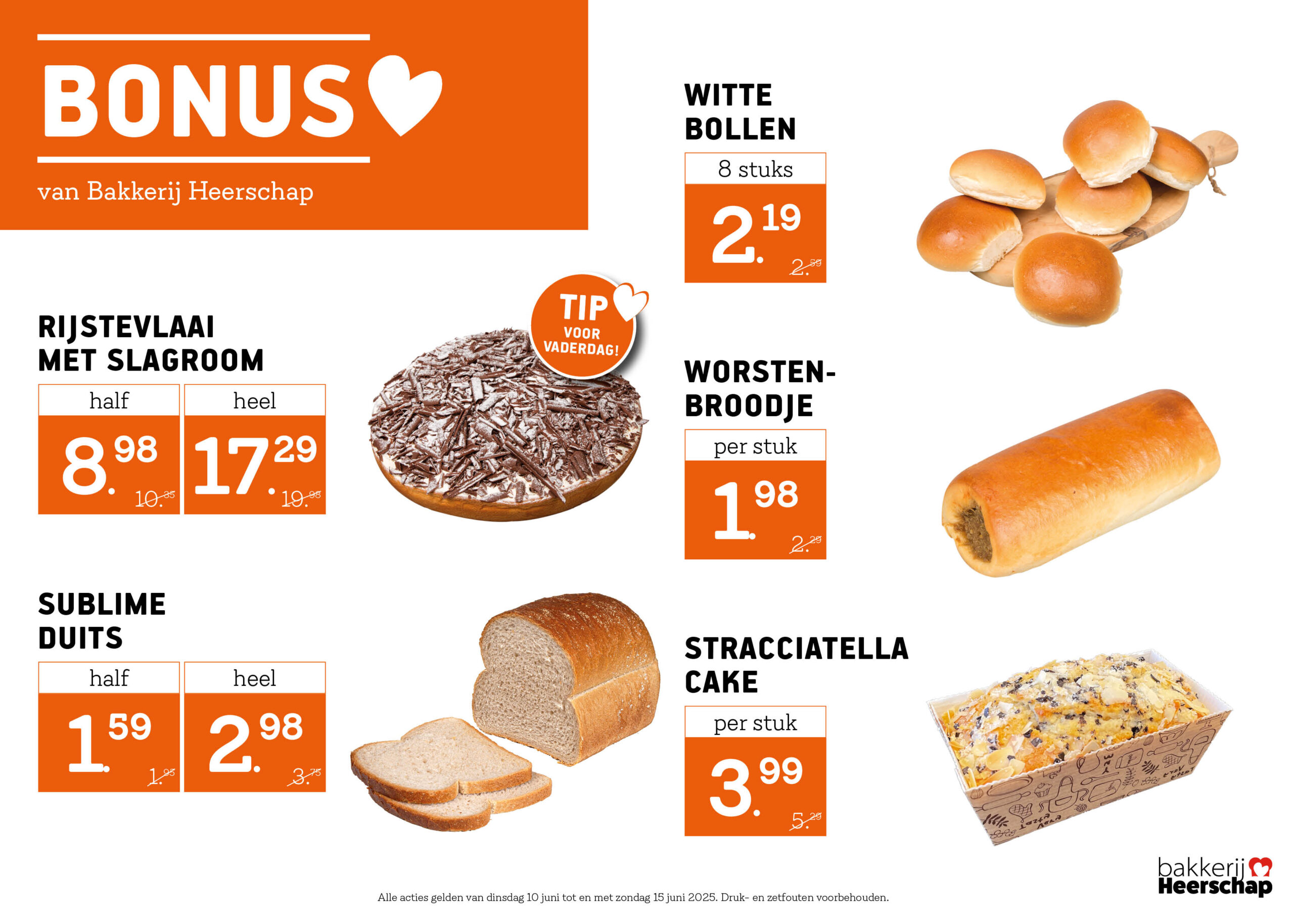 Geniet van versgebakken ambachtelijke broden, de heerlijkste vlaaien en seizoensgebonden producten. Zo vers en zo lekker, dat kiezen een kunst op zich is. De producten van Bakkerij Heerschap worden 365 dagen per jaar met liefde voor je gemaakt en dat proef je! Iedere week selecteren de bakkers nieuwe weekacties voor jou. Welke actie kies jij?