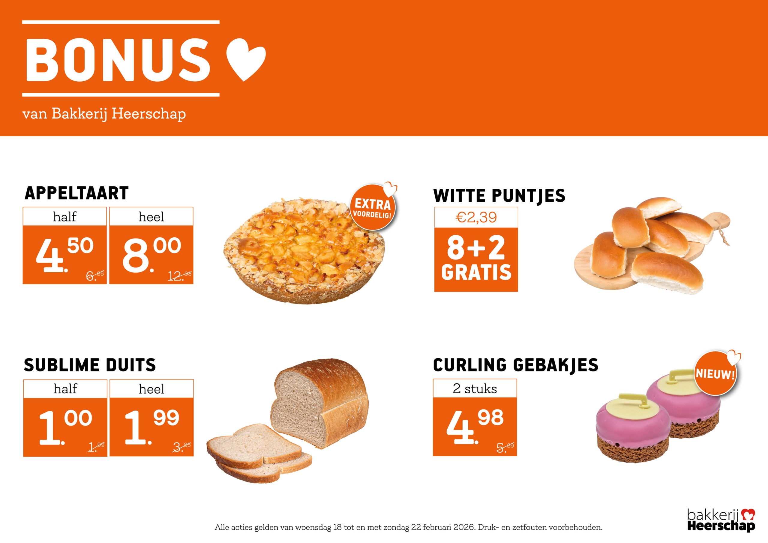 Geniet van versgebakken ambachtelijke broden, de heerlijkste vlaaien en seizoensgebonden producten. Zo vers en zo lekker, dat kiezen een kunst op zich is. De producten van Bakkerij Heerschap worden 365 dagen per jaar met liefde voor je gemaakt en dat proef je! Iedere week selecteren de bakkers nieuwe weekacties voor jou. Welke actie kies jij?