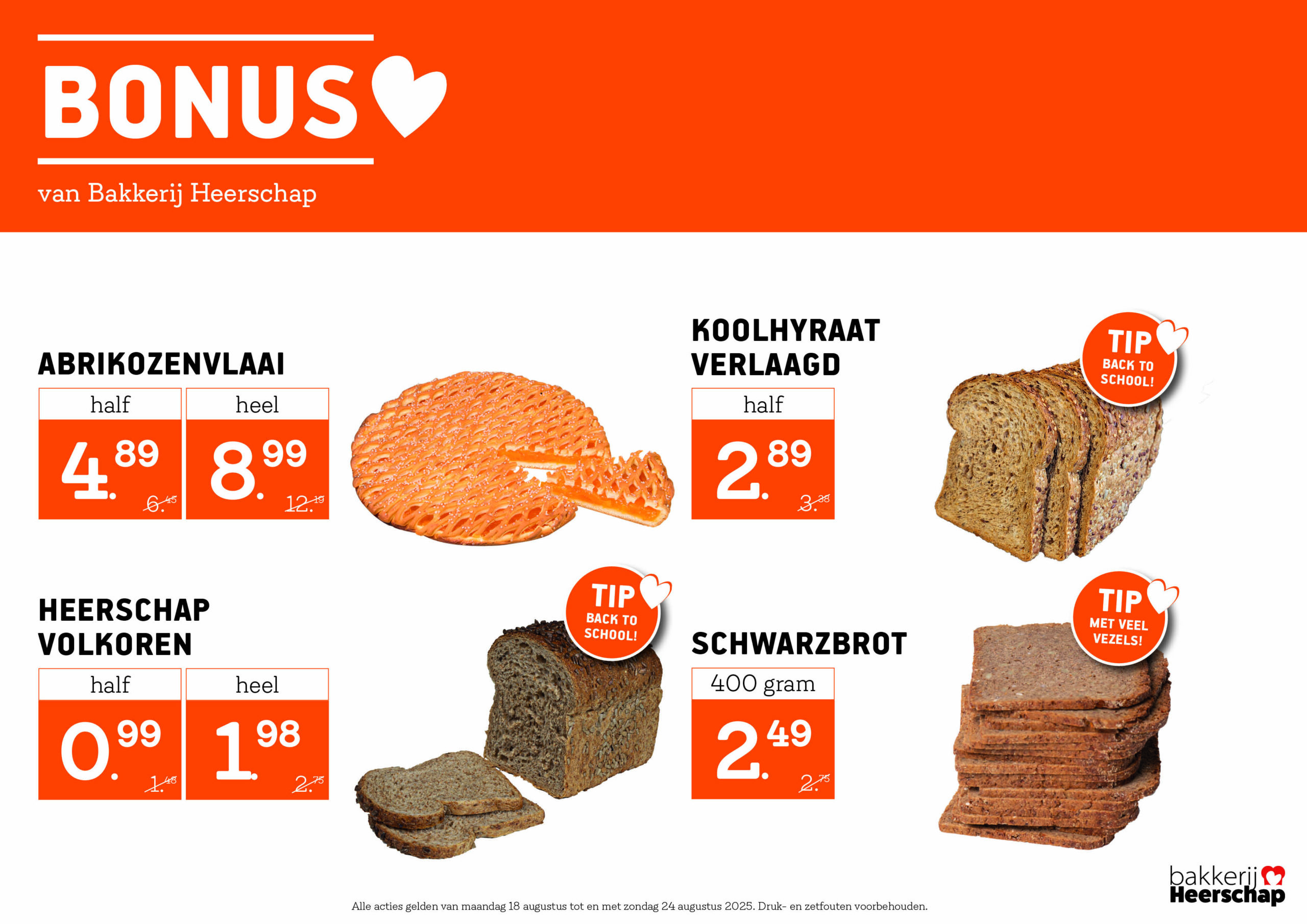 Geniet van versgebakken ambachtelijke broden, de heerlijkste vlaaien en seizoensgebonden producten. Zo vers en zo lekker, dat kiezen een kunst op zich is. De producten van Bakkerij Heerschap worden 365 dagen per jaar met liefde voor je gemaakt en dat proef je! Iedere week selecteren de bakkers nieuwe weekacties voor jou. Welke actie kies jij?